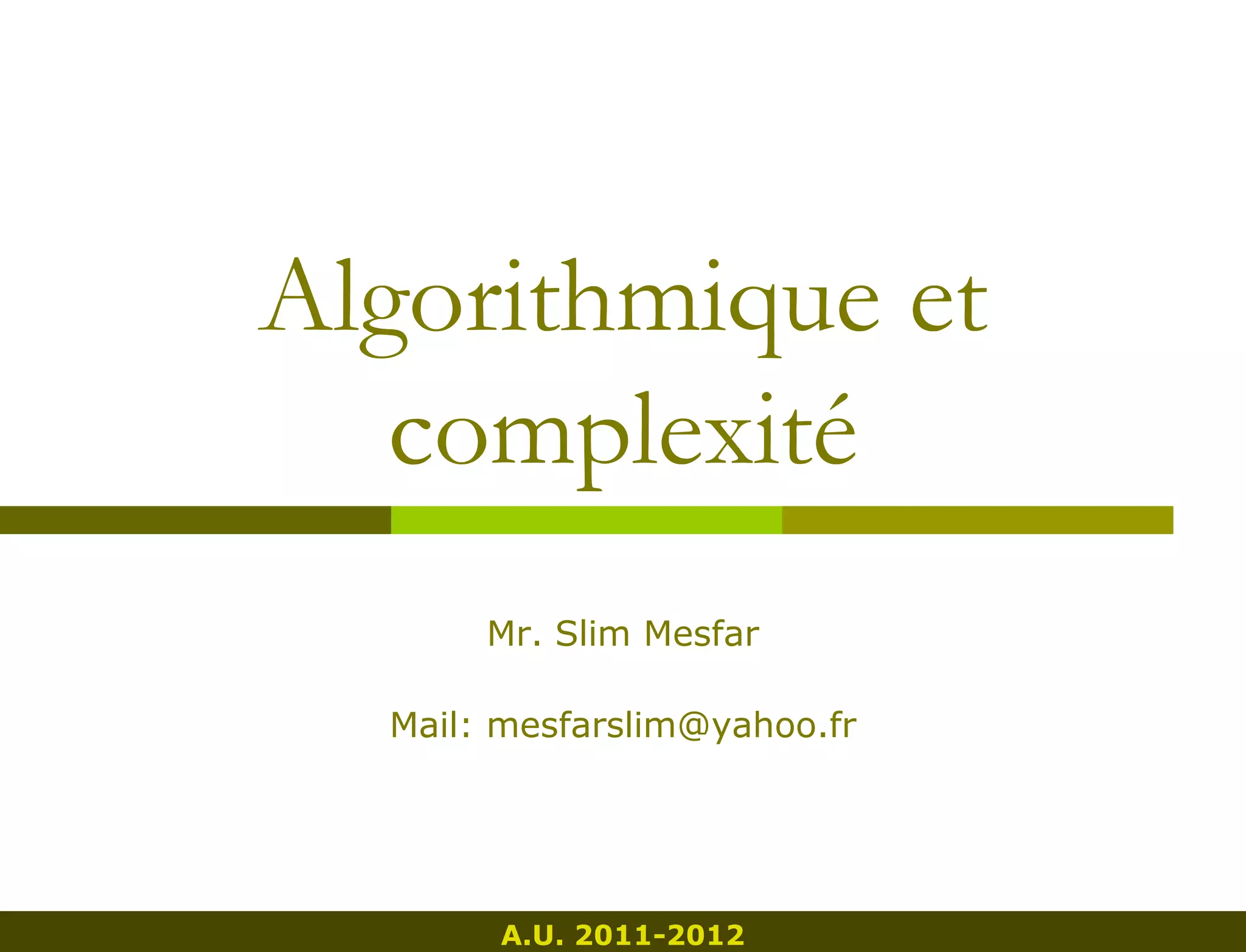 Ce document présente un cours sur l'algorithmique et la complexité, abordant des concepts clés tels que la définition d'un algorithme, les structures de données, les algorithmes de tri, et la récursivité. Il détaille également les cotes de complexité, les classes de complexité et des exemples d'algorithmes, tout en soulignant l'importance d'analyser la complexité avant l'implémentation. Enfin, il souligne les objectifs du cours, qui incluent l'élaboration d'algorithmes performants et le développement d'une compréhension approfondie des concepts de complexité et d'optimalité.