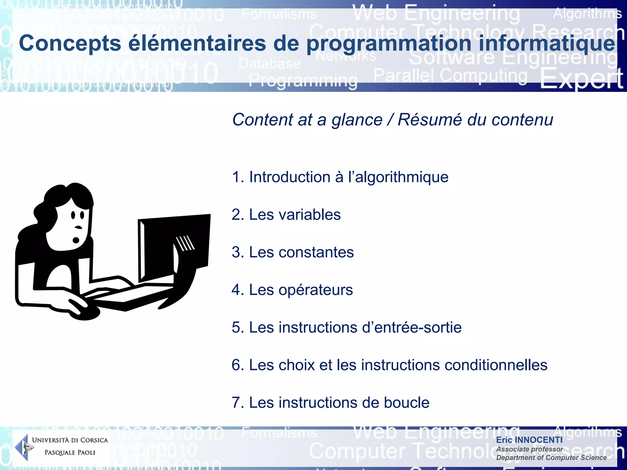 Le document aborde les concepts fondamentaux de l'algorithmique et de la programmation informatique, couvrant des sujets tels que les variables, les constantes, et les instructions d'entrée-sortie. Il explique également la notion d'algorithme, son développement historique, et l'utilisation des pseudo-langages pour la description logique des algorithmes. Enfin, le texte détaille les types de variables et leur utilisation dans le langage PHP.