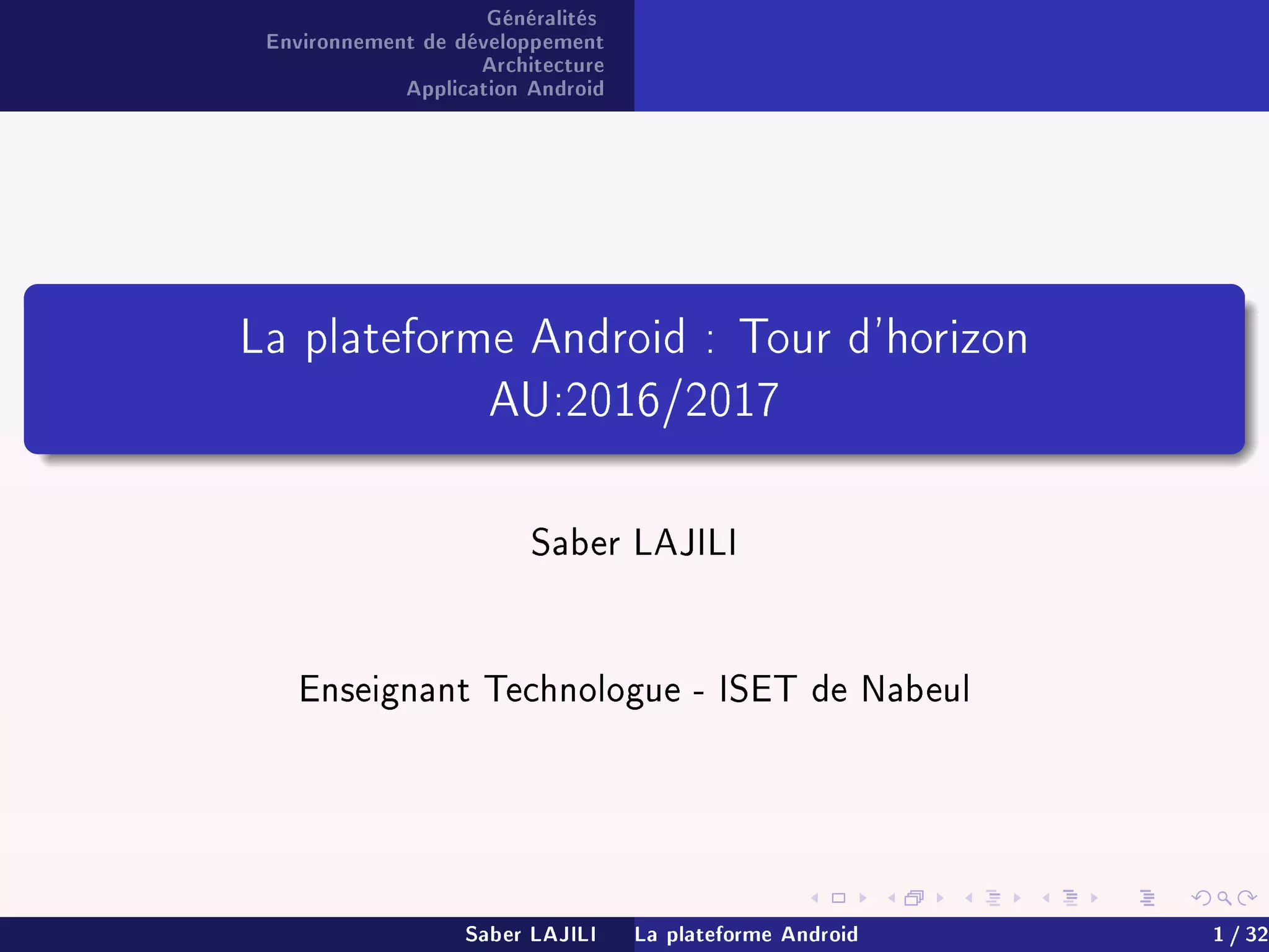 Ce document présente un aperçu complet de la plateforme Android, décrivant son historique, son environnement de développement et son architecture. Android est un système d'exploitation open source pour appareils mobiles, avec une architecture multi-niveaux pour gérer les ressources. Les composants d'une application Android incluent des activités, services, fournisseurs de données et récepteurs de diffusion, chacun jouant un rôle clé dans le fonctionnement des applications.
