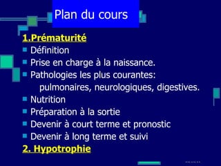Le document présente un cours pour les étudiantes sages-femmes de troisième année, se concentrant sur la prématurité et l'hypotrophie, y compris les définitions, la prise en charge, et les pathologies courantes associées. Il aborde les complications respiratoires, neurologiques et digestives liées à la prématurité, ainsi que les stratégies nutritionnelles et le suivi à long terme pour ces nouveau-nés. Enfin, des points sur la prévention et le traitement des diverses pathologies rencontrées sont également discutés.