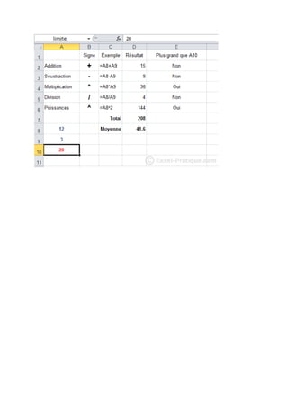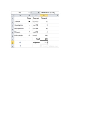 Ce document est un cours introductif sur les bases d'Excel, incluant des instructions sur la saisie de texte, la mise en forme, l'alignement, la fusion de cellules et l'utilisation de formules et fonctions. Il aborde également des fonctionnalités avancées comme l'insertion d'objets tels que des formes, des images et des graphiques SmartArt, ainsi que des conseils pour l'enregistrement et l'impression des fichiers Excel. Ce tutoriel est conçu pour aider les débutants à naviguer et à utiliser efficacement les principales fonctionnalités d'Excel.