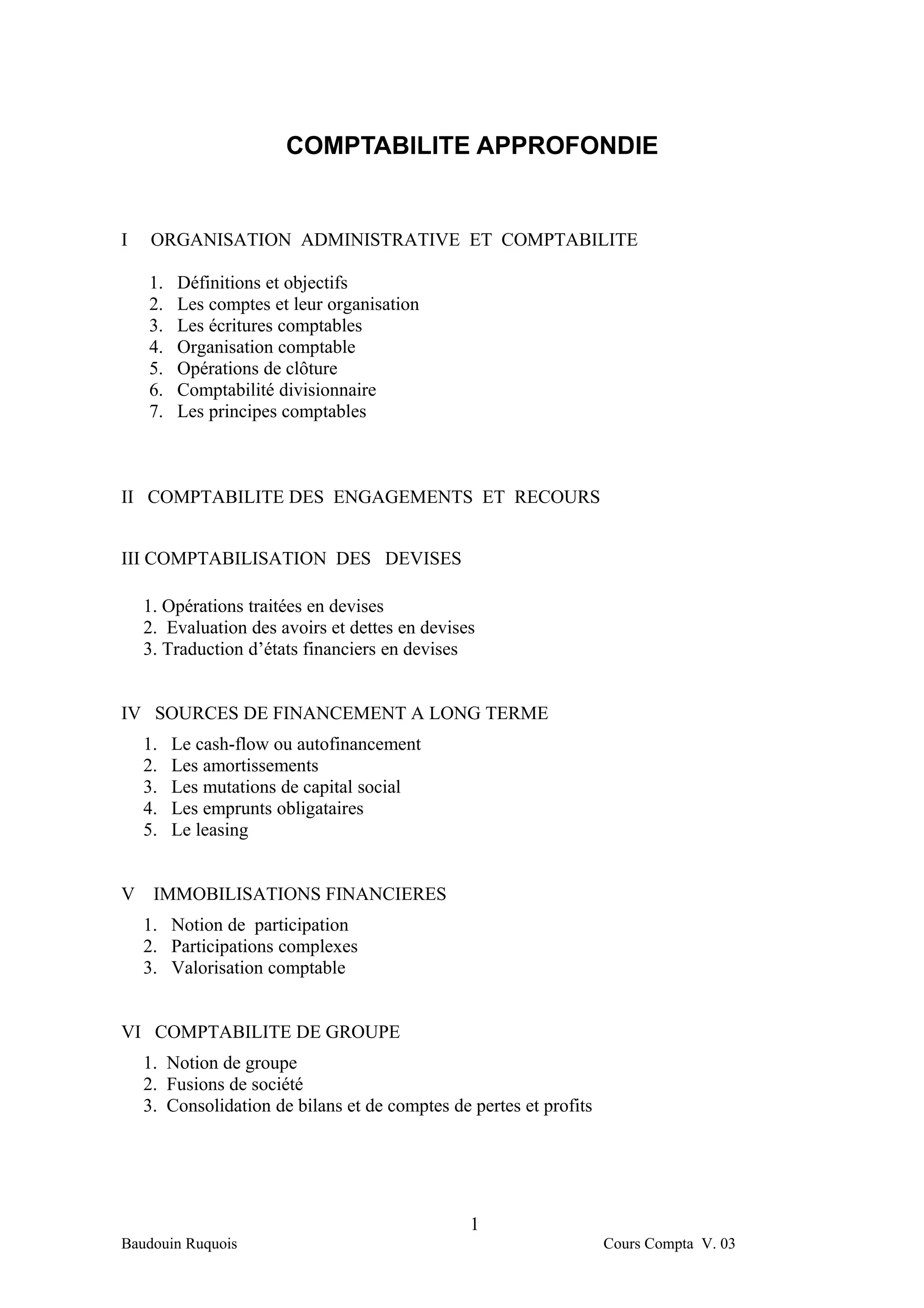 Le document traite des principes fondamentaux de la comptabilité, en se concentrant sur l'organisation administrative, les écritures comptables, la comptabilité de groupe et la consolidation. Il souligne l'importance d'une compréhension approfondie des règles comptables pour une interprétation correcte des états financiers, ainsi que la nécessité d'analyser les flux financiers selon divers critères. Enfin, il présente les différentes types de comptabilité, leurs objectifs et la manière dont les comptes sont organisés au sein d'une entreprise.