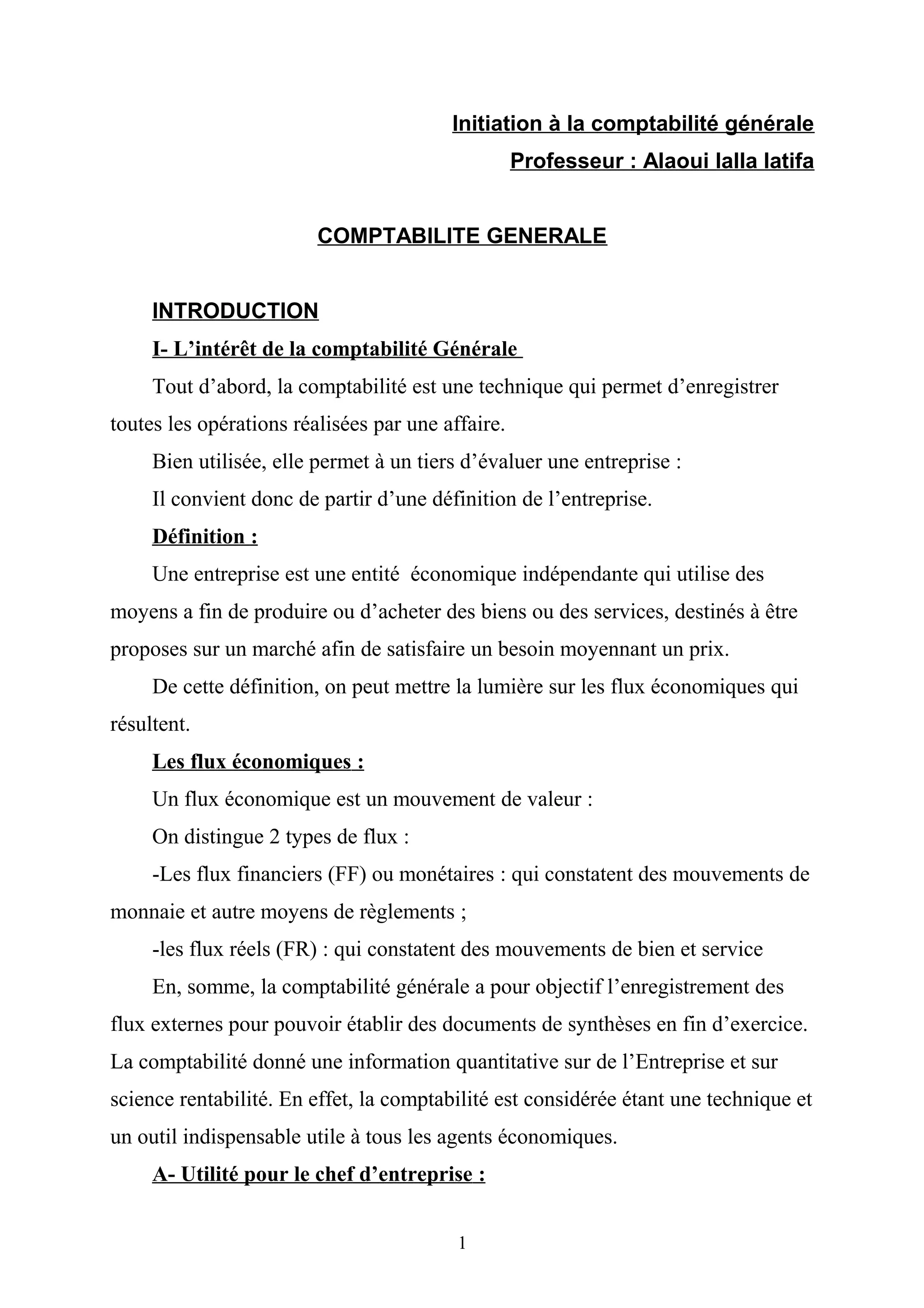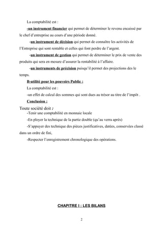 La comptabilité générale est essentielle pour enregistrer les opérations d'une entreprise, lui permettant d'évaluer sa rentabilité et d'effectuer des décisions financières. Le bilan, un tableau représentant les actifs et passifs d'une entreprise, fournit un aperçu de ses ressources et de leur utilisation. La comptabilité est considérée comme un outil indispensable pour la gestion et le fonctionnement des affaires.