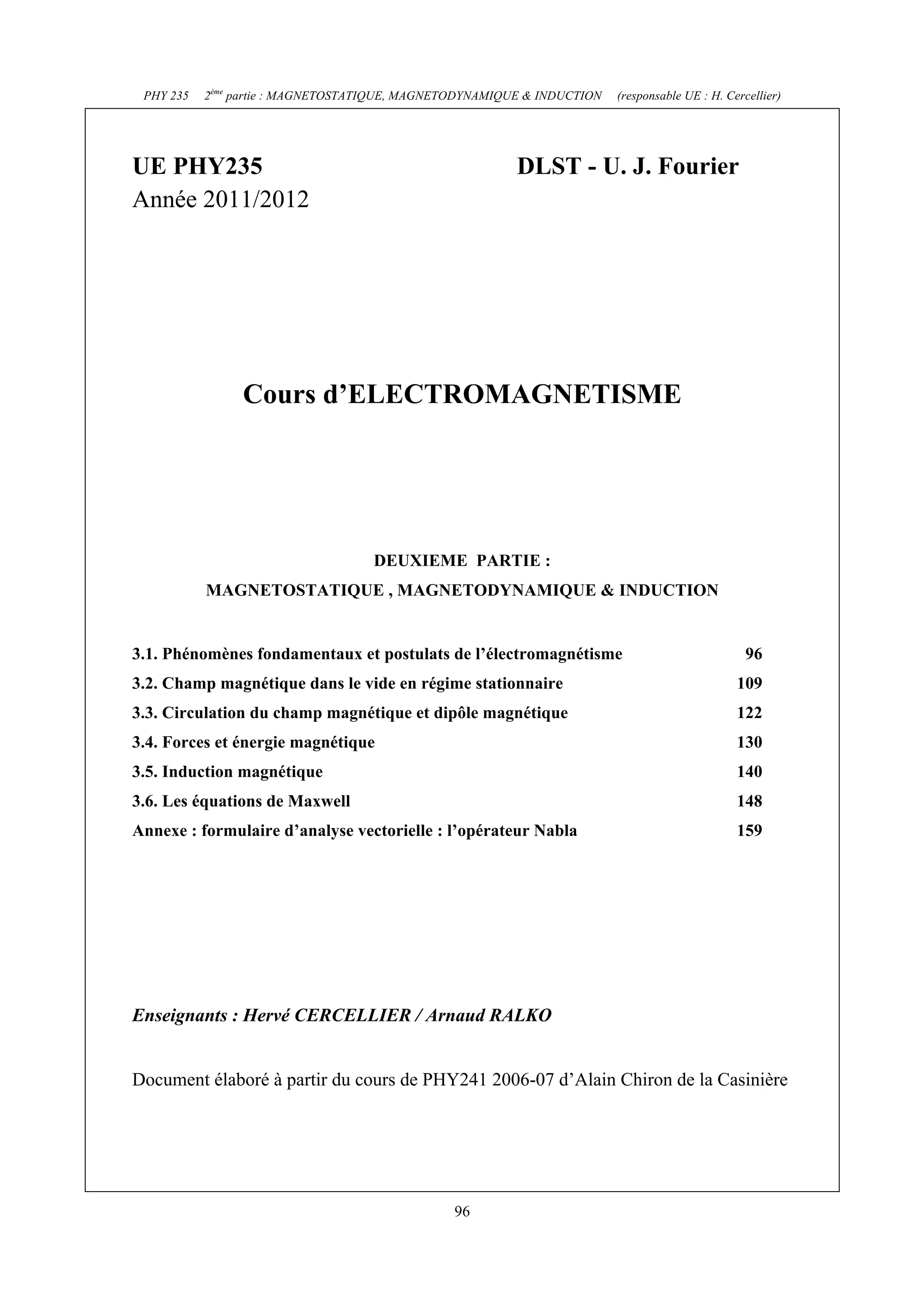 Le document couvre la deuxième partie d'un cours sur l'électromagnétisme, incluant la magnetostatique, la magnetodynamique et l'induction, avec un accent sur les lois fondamentales et les équations de Maxwell établissant des relations entre électricité et magnétisme. Il décrit diverses expériences et postulats, comme l'interaction entre circuits électriques, et introduit des concepts tels que la force de Lorentz et l'effet Hall. Des exemples pratiques, tels que le comportement des charges dans un champ magnétique, illustrent les principes électromagnétiques discutés.