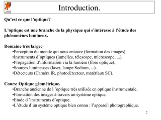 Le document traite de l'optique géométrique et de son application en photographie, abordant les notions fondamentales telles que la nature de la lumière, ses caractéristiques, et les interactions lumière-matière. Il explique les principes de propagation de la lumière, notamment les réflexions et les réfractions, ainsi que la formation d'images à travers des systèmes optiques. Les contenus incluent également des détails sur les lois de Snell et les différentes applications dans la conception d'instruments optiques.