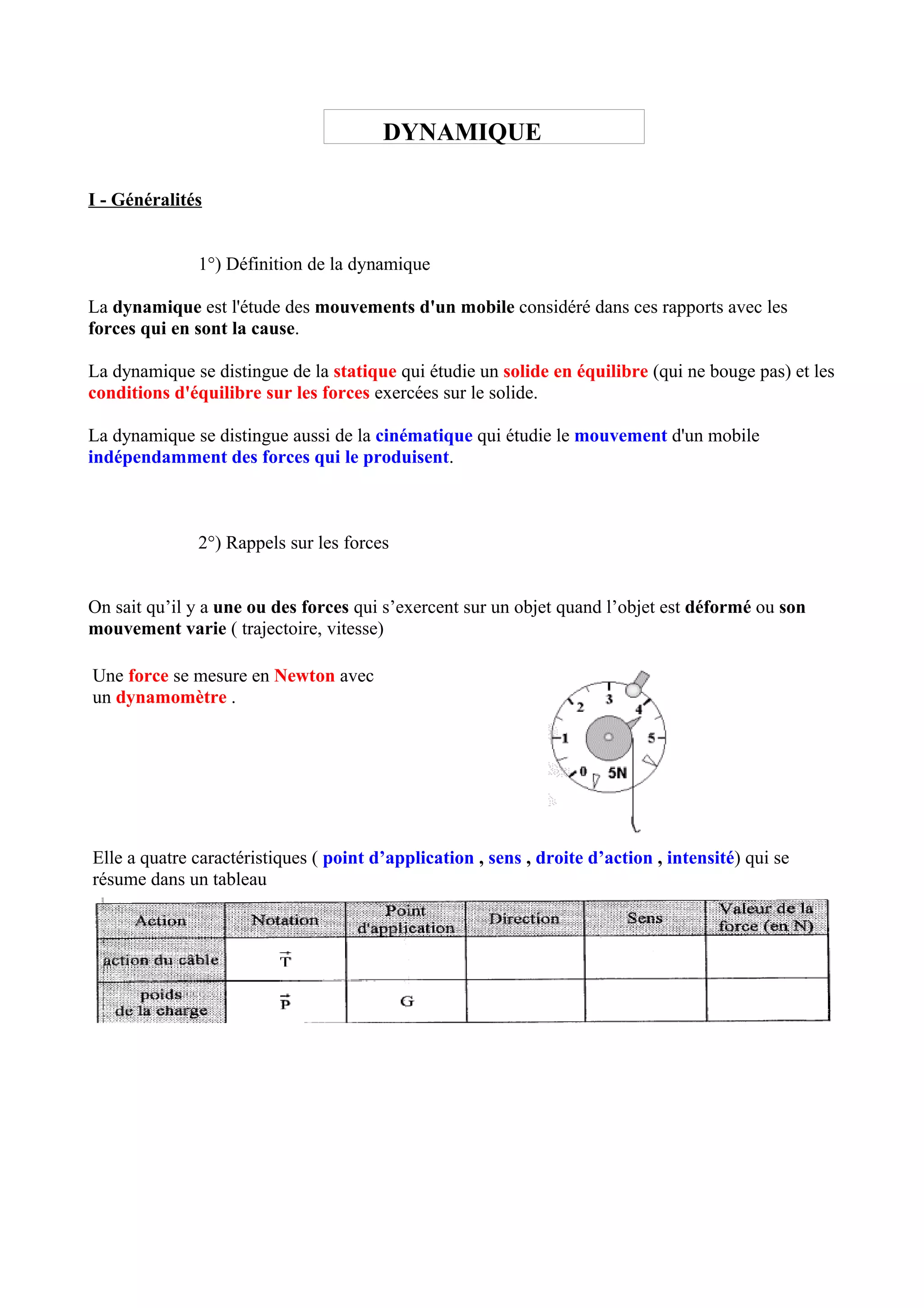 La dynamique étudie les mouvements des objets et les forces qui les provoquent, en contraste avec la statique et la cinématique. Le principe fondamental de la dynamique relie les forces agissant sur un objet à son accélération, tandis que le moment d'une force est déterminé par sa distance au point d'application et son intensité. La dynamique peut être appliquée à divers cas pratiques, comme le mouvement d'un objet en chute libre ou l'accélération d'un véhicule.
