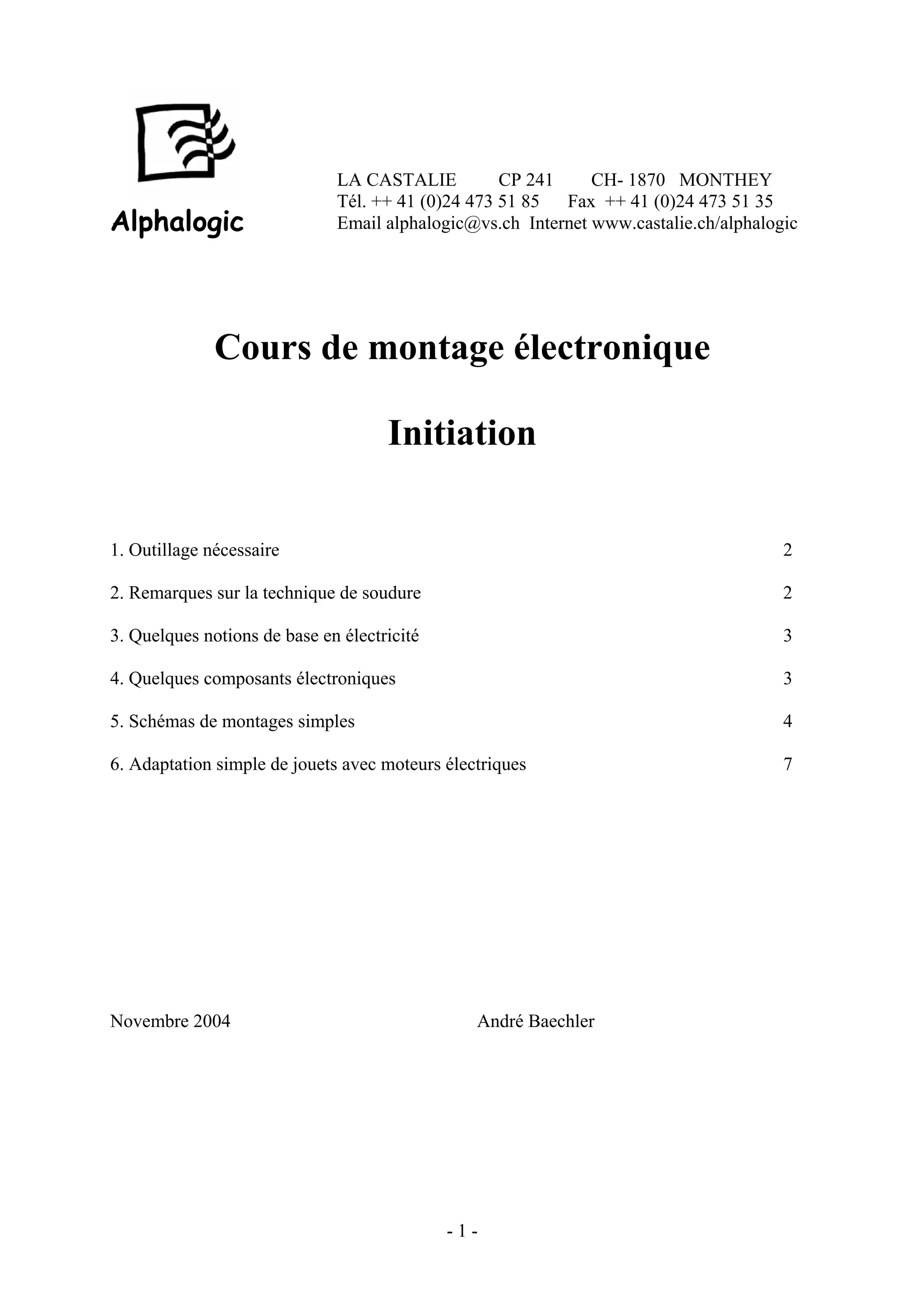 Ce document fournit un guide sur le montage électronique, y compris les outils nécessaires, les techniques de soudure et des notions de base en électricité. Il décrit également divers composants électroniques, des schémas de montages simples et des adaptations de jouets avec moteurs électriques. L'objectif est d'initier les lecteurs à l'électronique et à la réalisation de projets pratiques.