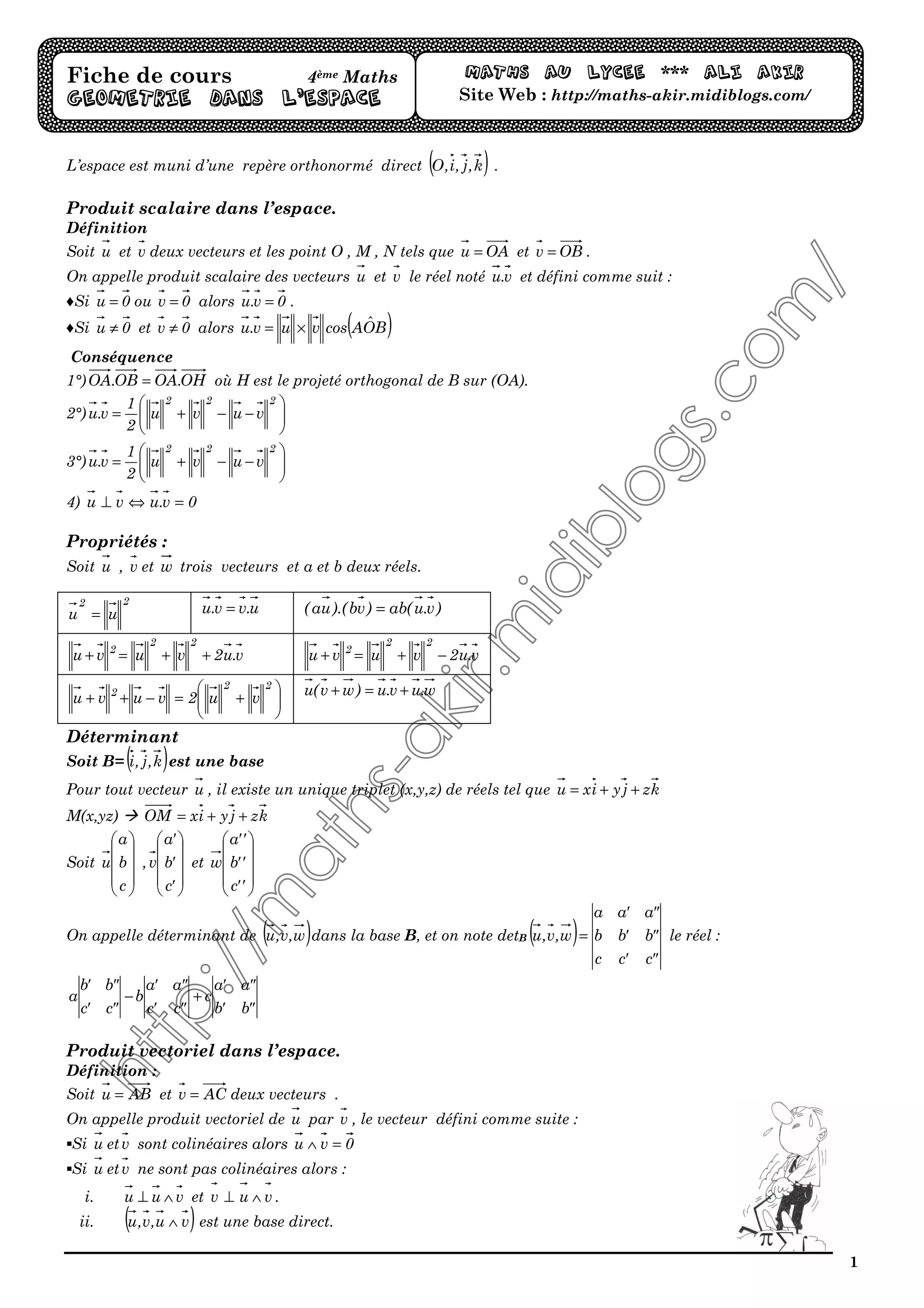 Le document traite des concepts fondamentaux relatifs aux vecteurs dans l'espace, y compris le produit scalaire et le produit vectoriel, ainsi que leurs propriétés. Il aborde aussi les transformations géométriques telles que les translations et les homothéties, et leur impact sur les figures géométriques dans l'espace. Enfin, il mentionne des opérations géométriques comme le calcul des aires et des volumes dans le contexte des vecteurs et des formes géométriques.