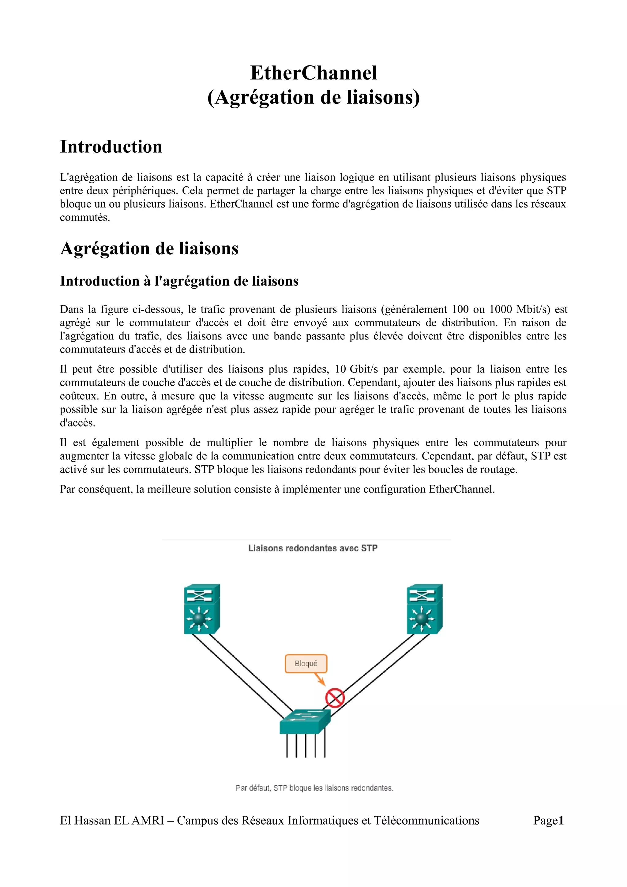 EtherChannel regroupe plusieurs liaisons commutées pour équilibrer la charge entre deux périphériques tout en évitant les boucles de routage grâce à STP. Tous les ports d'un EtherChannel doivent être configurés avec les mêmes vitesses, modes et VLAN, et peuvent être gérés par les protocoles PAgP et LACP pour une configuration automatique. En cas de défaillance d'une liaison, l'EtherChannel continue de fonctionner normalement tant qu'une liaison physique reste active.