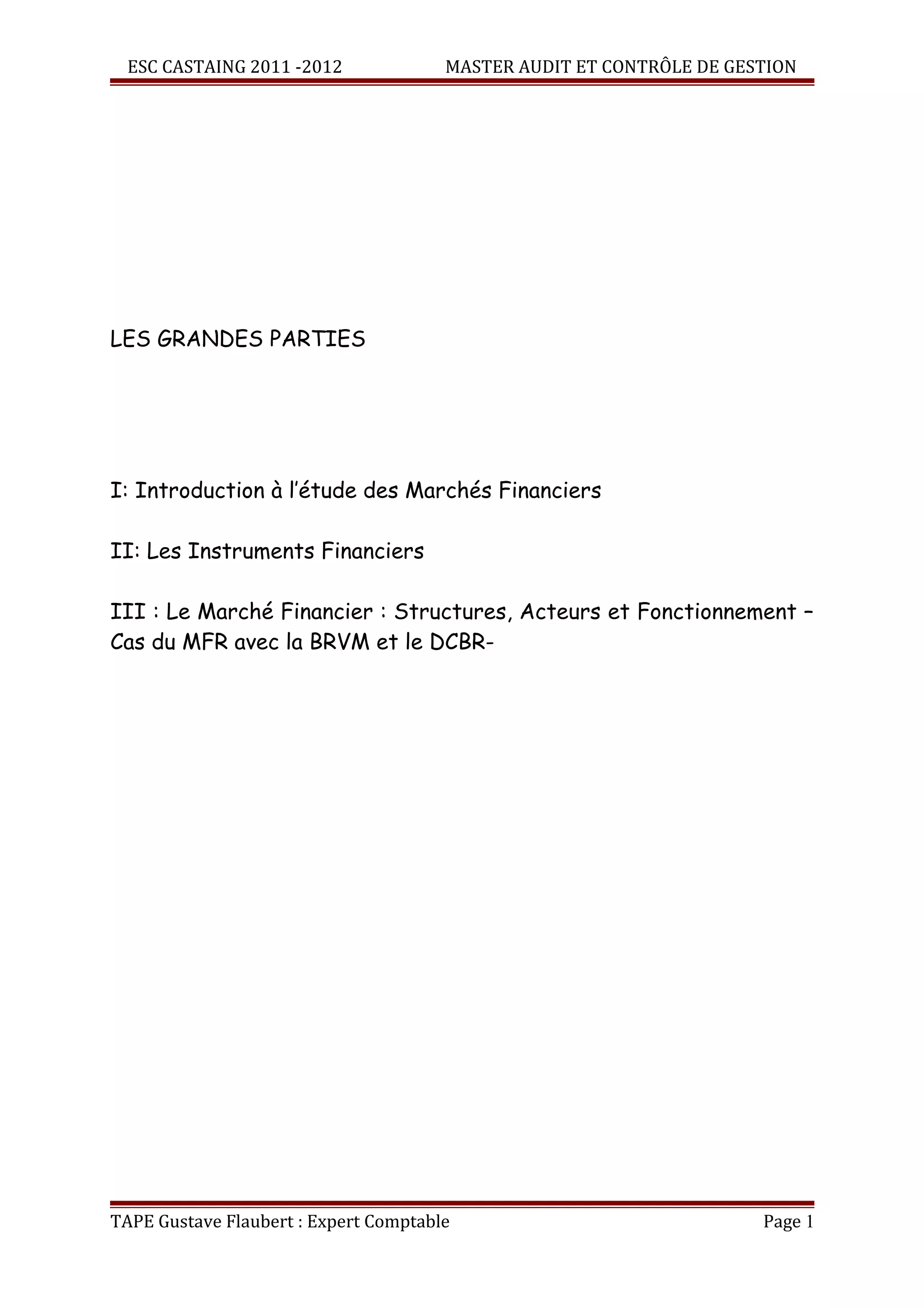 Le document présente un cours sur l'audit et le contrôle de gestion, détaillant les marchés financiers et leurs structures. Il distingue entre le financement interne et externe, et examine les marchés d'intermédiation financière. Le document aborde également les instruments financiers, tels que les titres de créance négociables et les marchés primaires et secondaires.