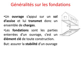Le document traite des fondations en construction, soulignant leur rôle crucial dans la transmission des charges au sol et la garantie de la stabilité d'une structure. Il décrit les types de fondations - superficielles et profondes - ainsi que les critères de choix, notamment la qualité du sol et les charges supportées. Des détails sur la réalisation des pieux, leurs classifications et méthodes d'installation sont également fournis.