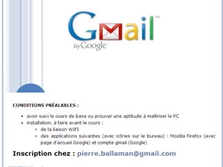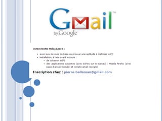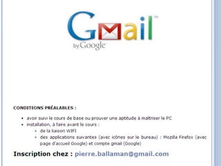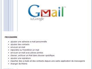 Le document décrit un programme de cours informatique sur la gestion de la messagerie, comprenant des sessions de formation prévue tous les mercredis. Les participants apprendront à configurer leur boîte de réception, à gérer leurs contacts et à envoyer des mails avec différentes options. Il est également mentionné d'importer des contacts d'autres fournisseurs de messagerie et d'apporter des questions ou expériences personnelles pour enrichir le cours.