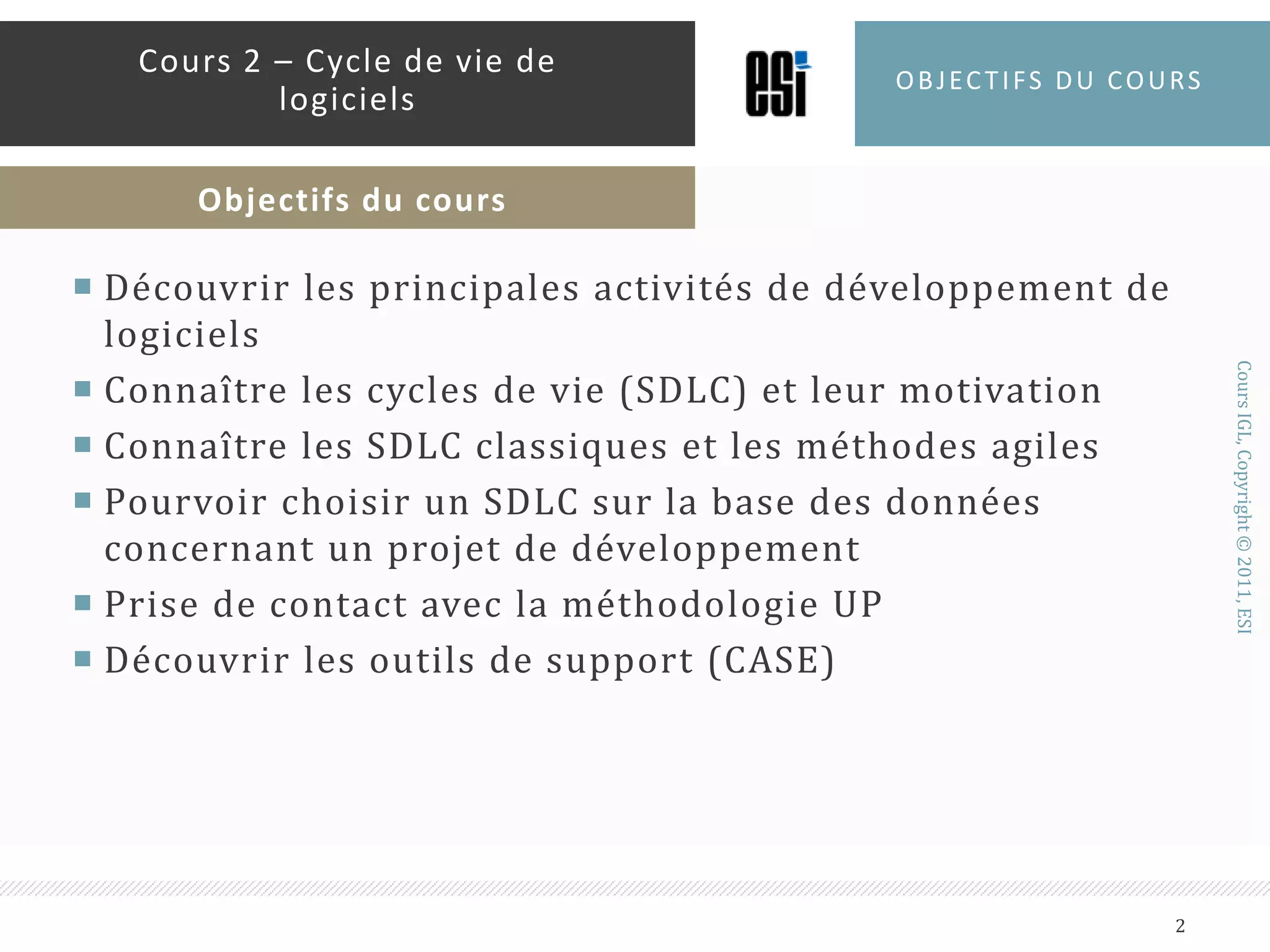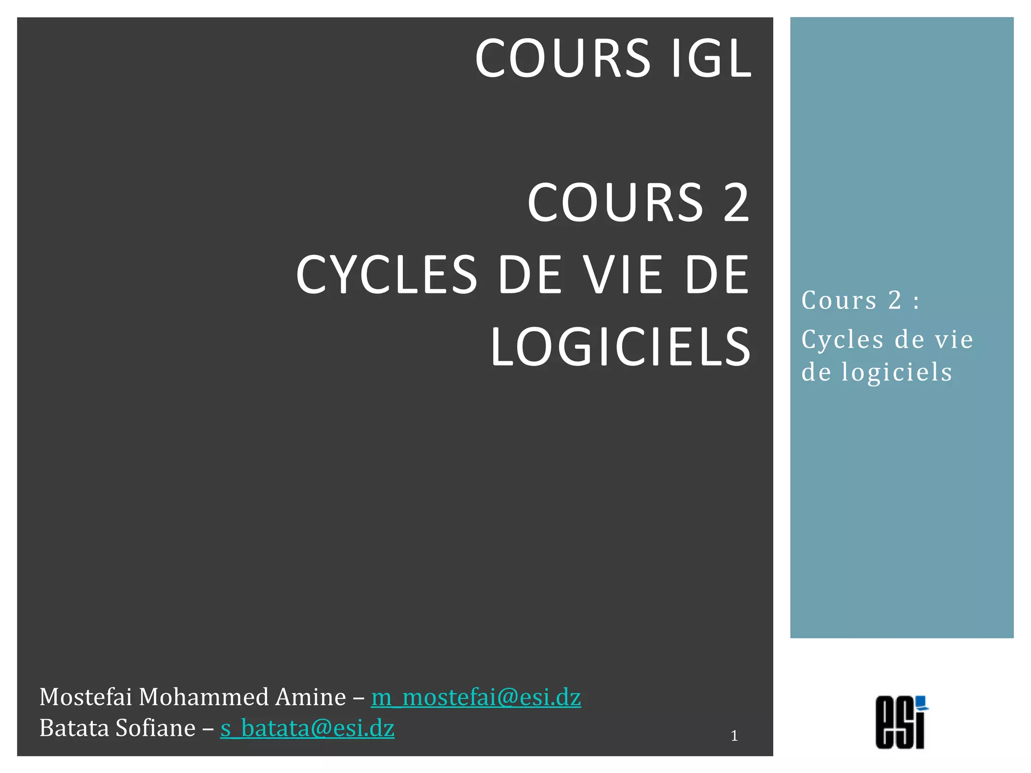 Le document présente les cycles de vie des logiciels, soulignant les étapes clés du développement, de la définition des besoins à la maintenance. Il compare différents modèles de cycle de vie, tels que le modèle en cascade, en V, prototypage, incrémental et en spirale, tout en discutant des méthodologies agiles qui privilégient la flexibilité et l'implication du client. Les enseignants proposent également des outils et méthodologies support pour choisir le modèle de cycle de vie adapté selon les projets.