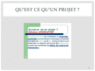 Le document traite de la gestion de projets, définissant un projet comme une activité temporaire visant à produire un bien ou service unique pour répondre à un besoin client. Il aborde les différences entre projets et opérations, l'organisation des équipes, les phases de vie d'un projet, et l'importance de la planification et de la gestion des ressources. Enfin, il souligne les rôles du maître d'ouvrage et du maître d'œuvre dans le succès d'un projet.