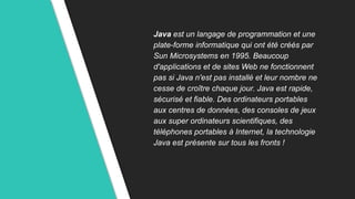 Java est un langage de programmation polyvalent créé par Sun Microsystems en 1995, largement utilisé pour le développement d'applications et de sites web. Il offre une compatibilité multiplateforme, une syntaxe simple, et est soutenu par une vaste communauté de développeurs. Le document aborde également les concepts fondamentaux de Java, y compris les variables, les opérateurs, les structures de contrôle, et les types de données.