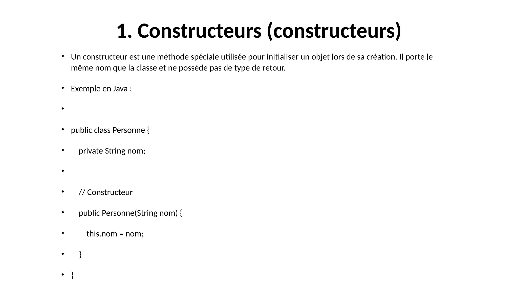 •Un constructeur est une méthode spéciale utilisée pour initialiser un objet lors de sa création. Il porte le
