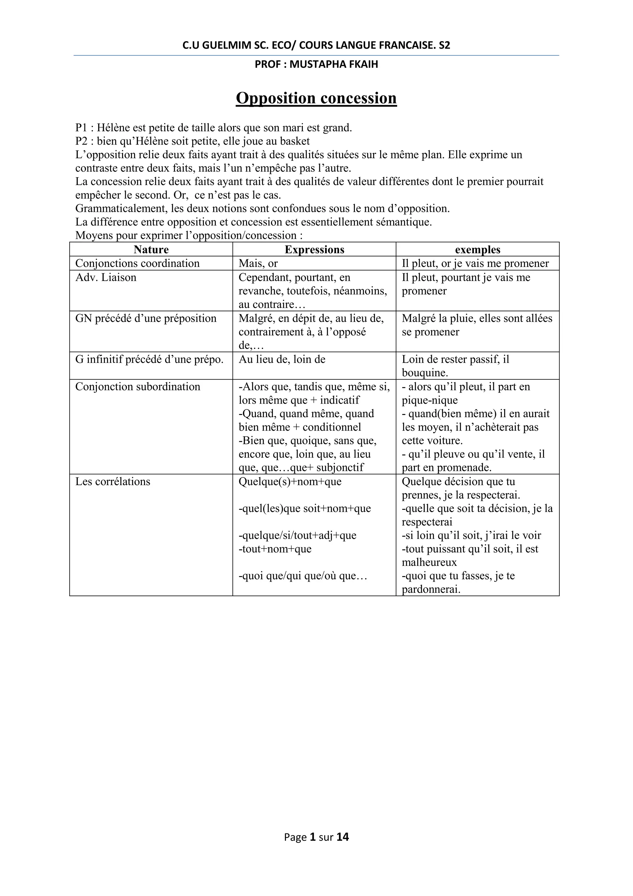 Le document traite de l'opposition et de la concession en français, expliquant les différences sémantiques entre les deux concepts et fournissant des exemples. Il aborde aussi l'expression des hypothèses et des causes, en détaillant les modalités grammaticales et les connecteurs appropriés. Enfin, il évoque l'expression de l'opinion et les pronoms relatifs composés, illustrant chacun de ces points avec des exemples pratiques.