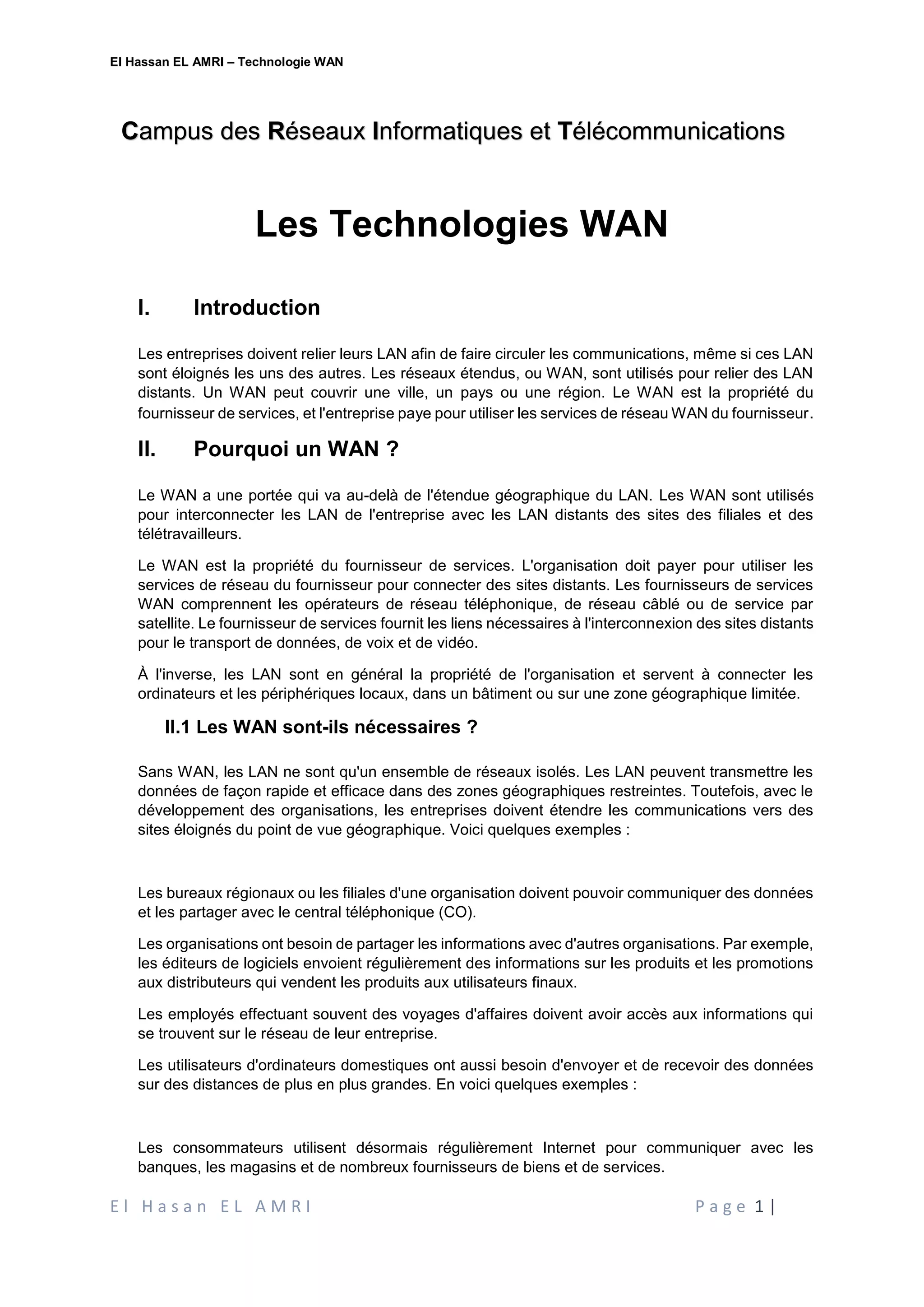 Le document présente les technologies de réseau étendu (WAN) utilisées pour interconnecter des réseaux locaux (LAN) situés à distance, souvent propriété des fournisseurs de services. Il détaille l'importance des WAN pour les communications d'entreprise, les différents types de protocoles, d'équipements et d'infrastructures qui les constituent, ainsi que les avantages et inconvénients des connexions, telles que les lignes louées, les liaisons commutées et le réseau numérique à intégration de services (RNIS). Enfin, il explique le fonctionnement des WAN au sein du modèle OSI, avec un accent particulier sur les couches physique et de liaison de données.