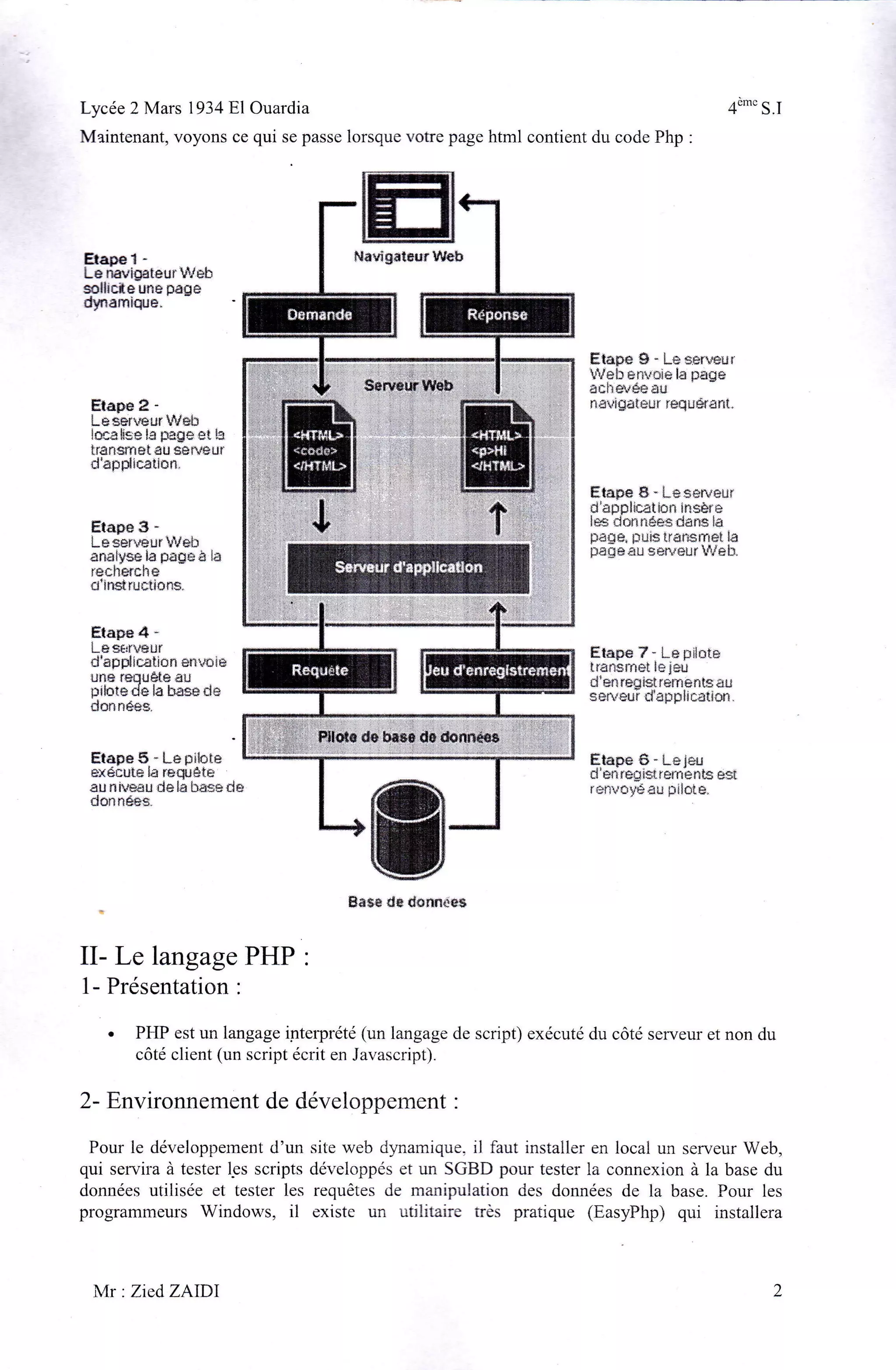 Ce document traite de la création de sites web dynamiques utilisant des technologies de script côté serveur, principalement PHP et MySQL. Il explique le fonctionnement du langage PHP, les bases de son environnement de développement, ainsi que la syntaxe et les concepts fondamentaux autour des variables, des structures de contrôle, et des formulaires. Enfin, il aborde la gestion des entrées/sorties et la manipulation de bases de données à l'aide de PHP.
