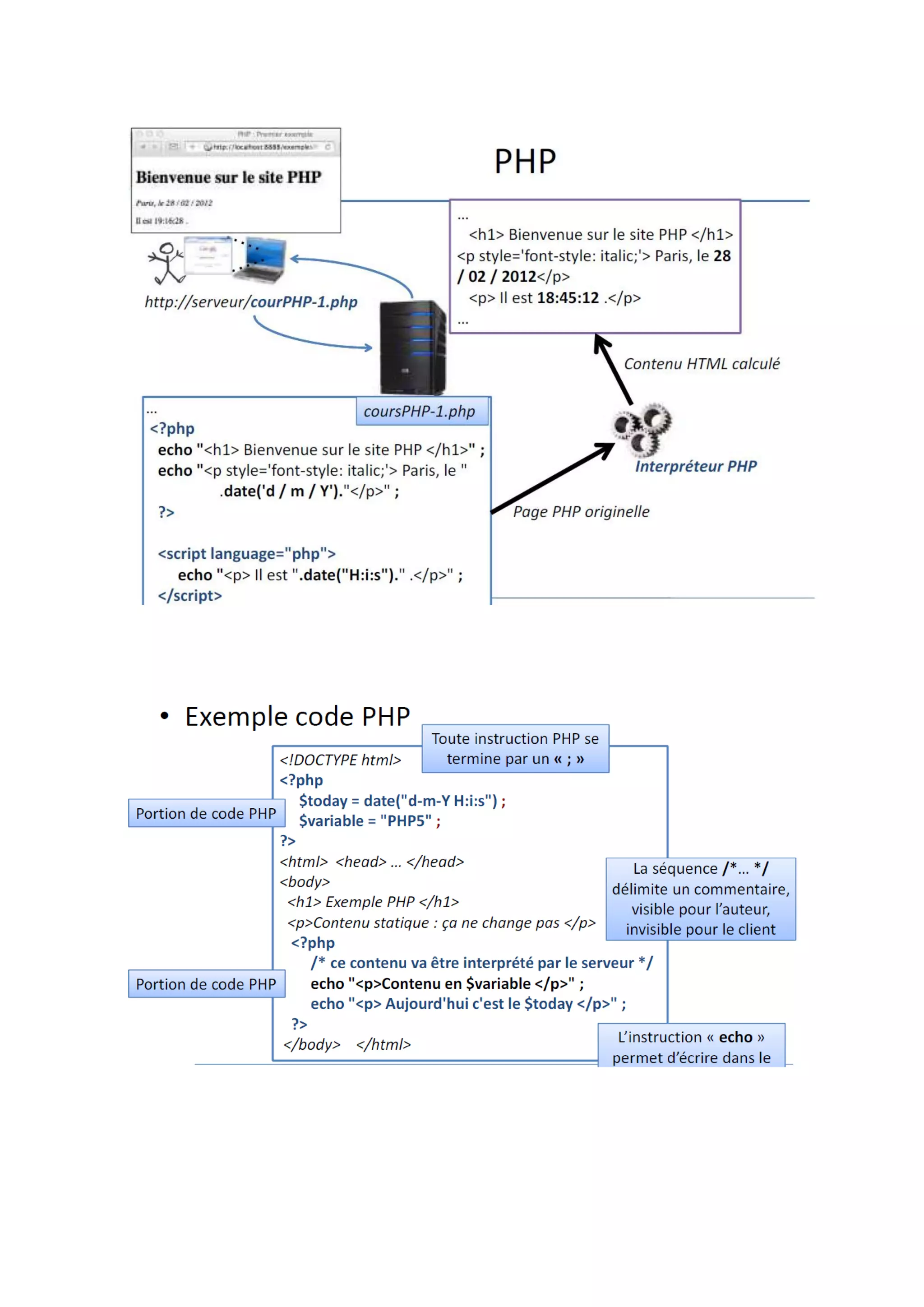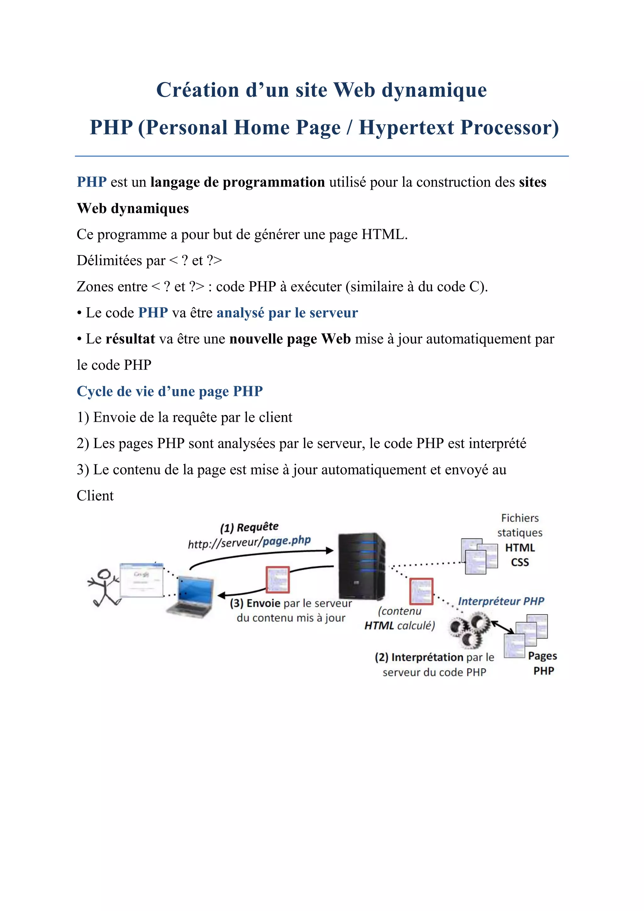 Le document décrit la création d'un site web dynamique en PHP, en expliquant le cycle de vie d'une page PHP et comment interagir avec les utilisateurs via des formulaires HTML. Il présente également des fonctions PHP, des structures conditionnelles, la gestion des sessions et l'accès aux bases de données MySQL et PostgreSQL. Des applications pratiques de scripts PHP illustrent les concepts abordés, tels que le calcul de factorielles et la gestion de sessions utilisateurs.