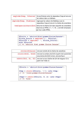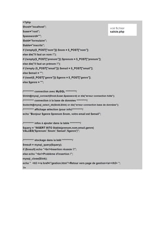 Le document décrit la création d'un site web dynamique en PHP, en expliquant le cycle de vie d'une page PHP et comment interagir avec les utilisateurs via des formulaires HTML. Il présente également des fonctions PHP, des structures conditionnelles, la gestion des sessions et l'accès aux bases de données MySQL et PostgreSQL. Des applications pratiques de scripts PHP illustrent les concepts abordés, tels que le calcul de factorielles et la gestion de sessions utilisateurs.