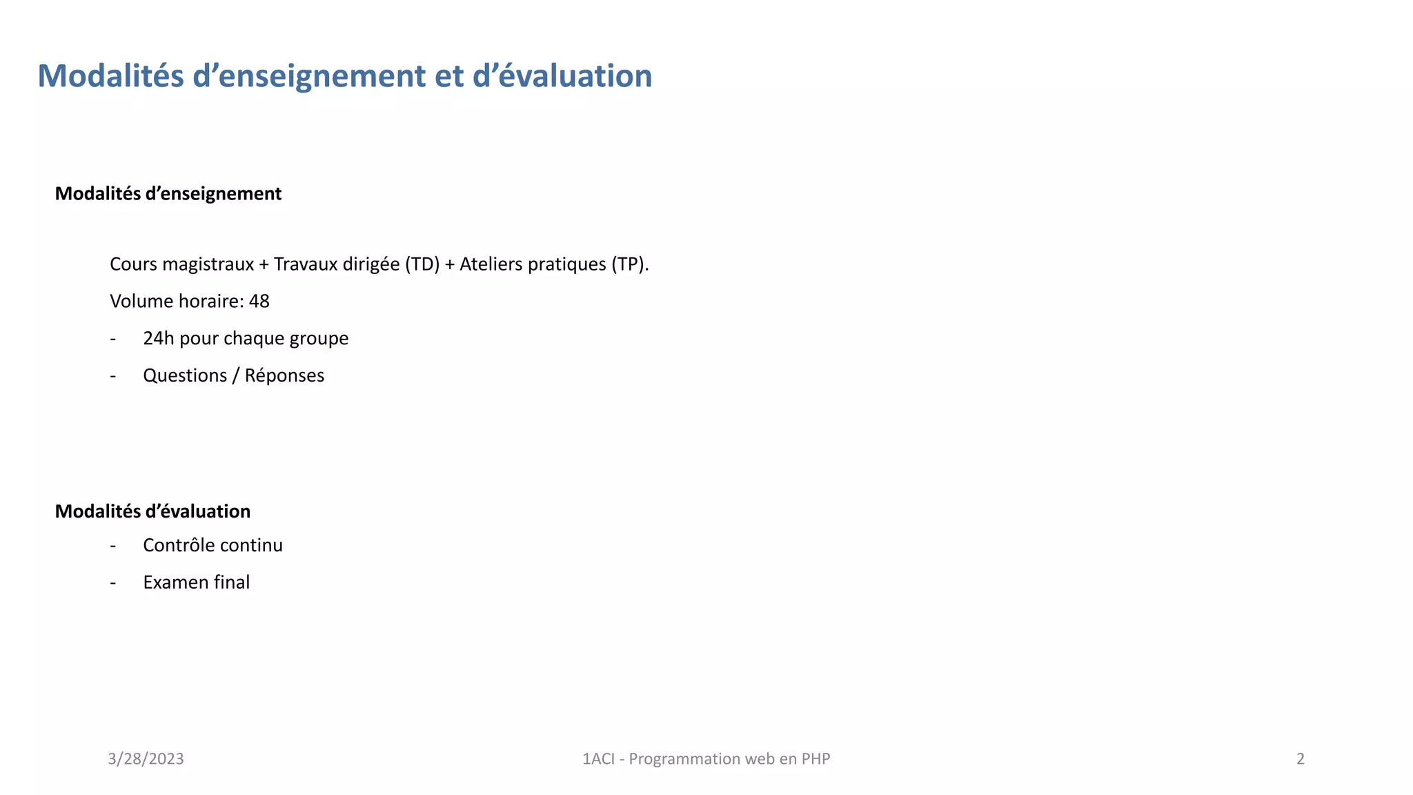 Le document présente le cours de programmation web en PHP pour le semestre 2 de 2022-2023, abordant les modalités d'enseignement et d'évaluation, ainsi que des concepts clés tels que les technologies du web, les variables, et les structures de contrôle. Il détaille notamment le fonctionnement du langage PHP, les instructions d'affichage, les types de variables et leurs portées, ainsi que les opérations sur les chaînes de caractères et les structures de contrôle et répétitives. Le document sert de base pour les travaux pratiques et dirigés, avec une approche approfondie des outils essentiels à la création d'applications web dynamiques.