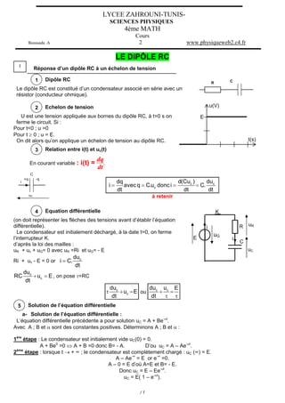 Ce document présente le comportement d'un dipôle RC en réponse à un échelon de tension, comprenant des équations différentielles pour modéliser la charge et la décharge d'un condensateur. Il détaille la solution de ces équations, les relations entre courant, tension et constante de temps, ainsi que des graphiques illustrant ces concepts. Enfin, il aborde la durée de charge d'un condensateur et les régimes transitoire et permanent associés.