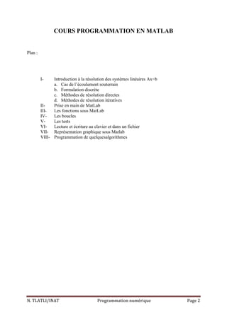 Le document traite de la programmation en Matlab, en se concentrant sur la résolution de systèmes linéaires, en particulier ceux liés à l'écoulement souterrain. Il présente des méthodes de discrétisation telles que la méthode des différences finies et décrit les méthodes directes et itératives pour résoudre les systèmes linéaires. Enfin, il fournit des détails sur les algorithmes comme la factorisation de Cholesky pour trouver des solutions efficaces.
