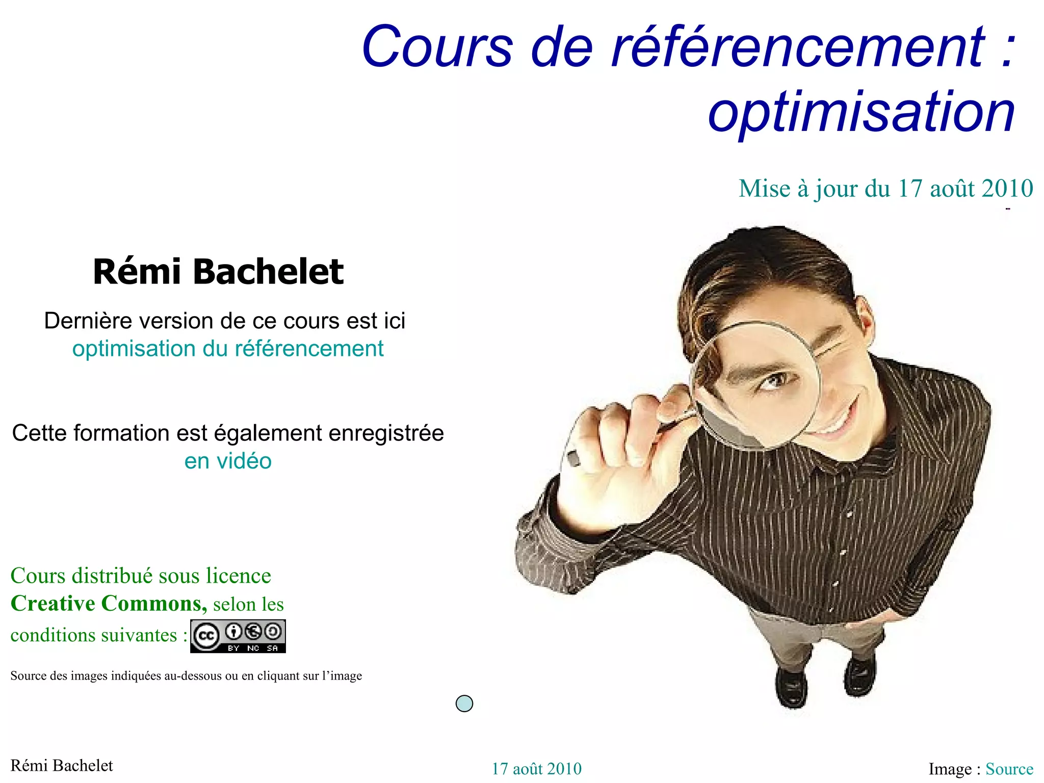 Ce cours sur le référencement porte sur l'optimisation des images et des pages web, en mettant l'accent sur l'importance des titres, des balises meta et des mots-clés. Il aborde les techniques d'optimisation sur page, hors page et les implications de l'architecture du site pour améliorer le référencement. Enfin, il distingue les pratiques éthiques ('white hat') des méthodes manipulatrices ('black hat') dans le SEO.
