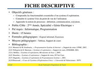 Ce document présente un cours sur les systèmes d'exploitation, axé sur la compréhension des fonctionnalités essentielles et du système Unix. Il décrit des concepts clés tels que la gestion des processus, la communication inter-processus et l'exécution multi-tâche, avec des instructions pratiques et des exemples. Le public cible est constitué d'étudiants en deuxième année de génie électrique avec une durée de formation de 15 heures.