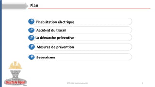 Le document traite des aspects de la santé et de la sécurité au travail, en se concentrant sur l'habilitation électrique et les mesures de prévention des accidents. Il décrit le processus d'habilitation, les obligations des travailleurs et de l'employeur, ainsi que l'importance de la formation et de la gestion des risques. Les étapes d'une démarche préventive sont également présentées, soulignant l'identification des risques et l'implantation de solutions.