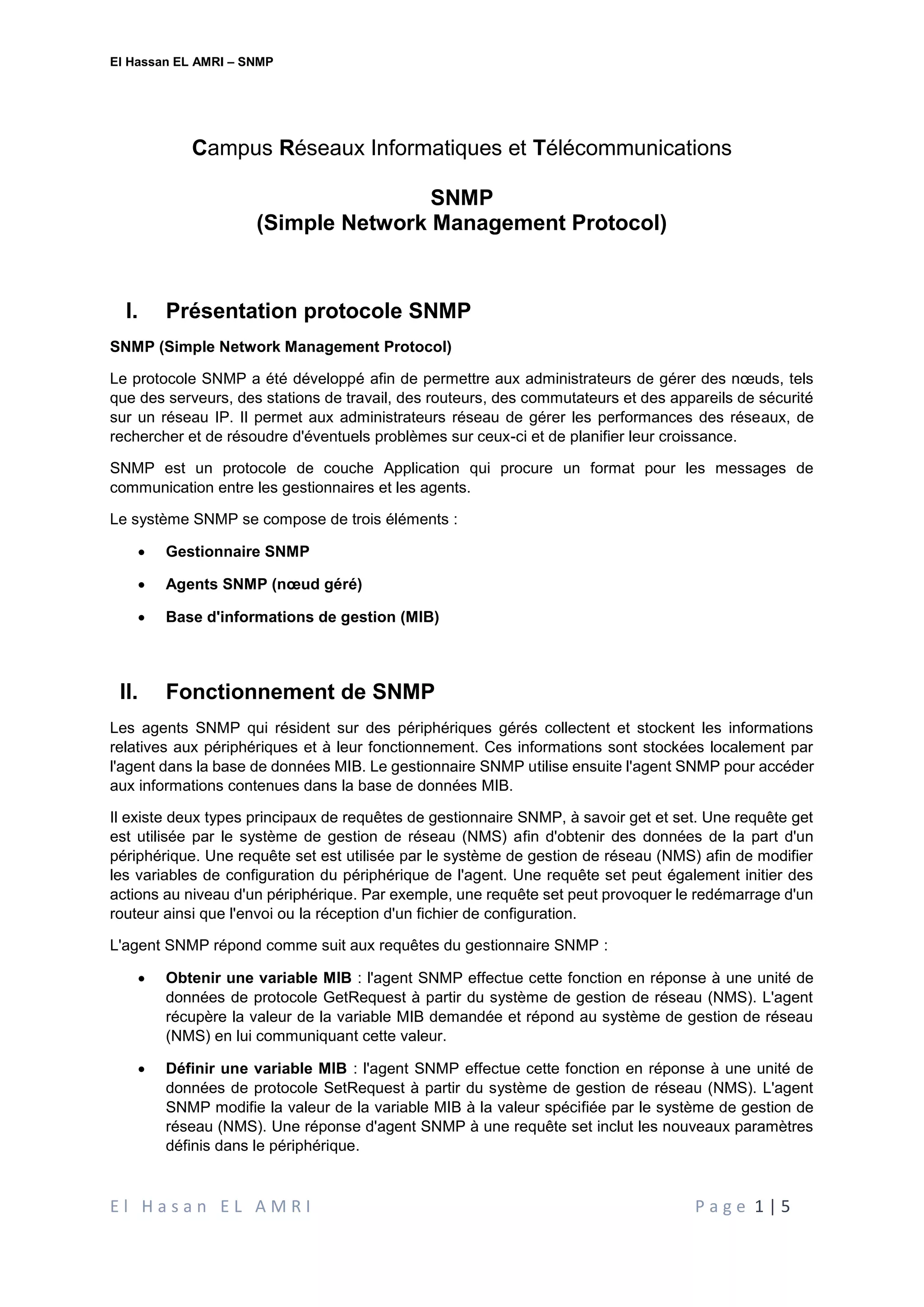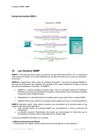 Le document présente le protocole SNMP (Simple Network Management Protocol), utilisé pour gérer des nœuds sur un réseau IP, en détaillant ses composants, son fonctionnement et ses requêtes. Il décrit les différentes versions de SNMP (v1, v2c et v3), leurs caractéristiques de sécurité, ainsi que les identifiants de communauté et la structure de la base d'informations de gestion (MIB). Enfin, il fournit des étapes pour configurer SNMP sur des périphériques réseau, notamment les commandes nécessaires.