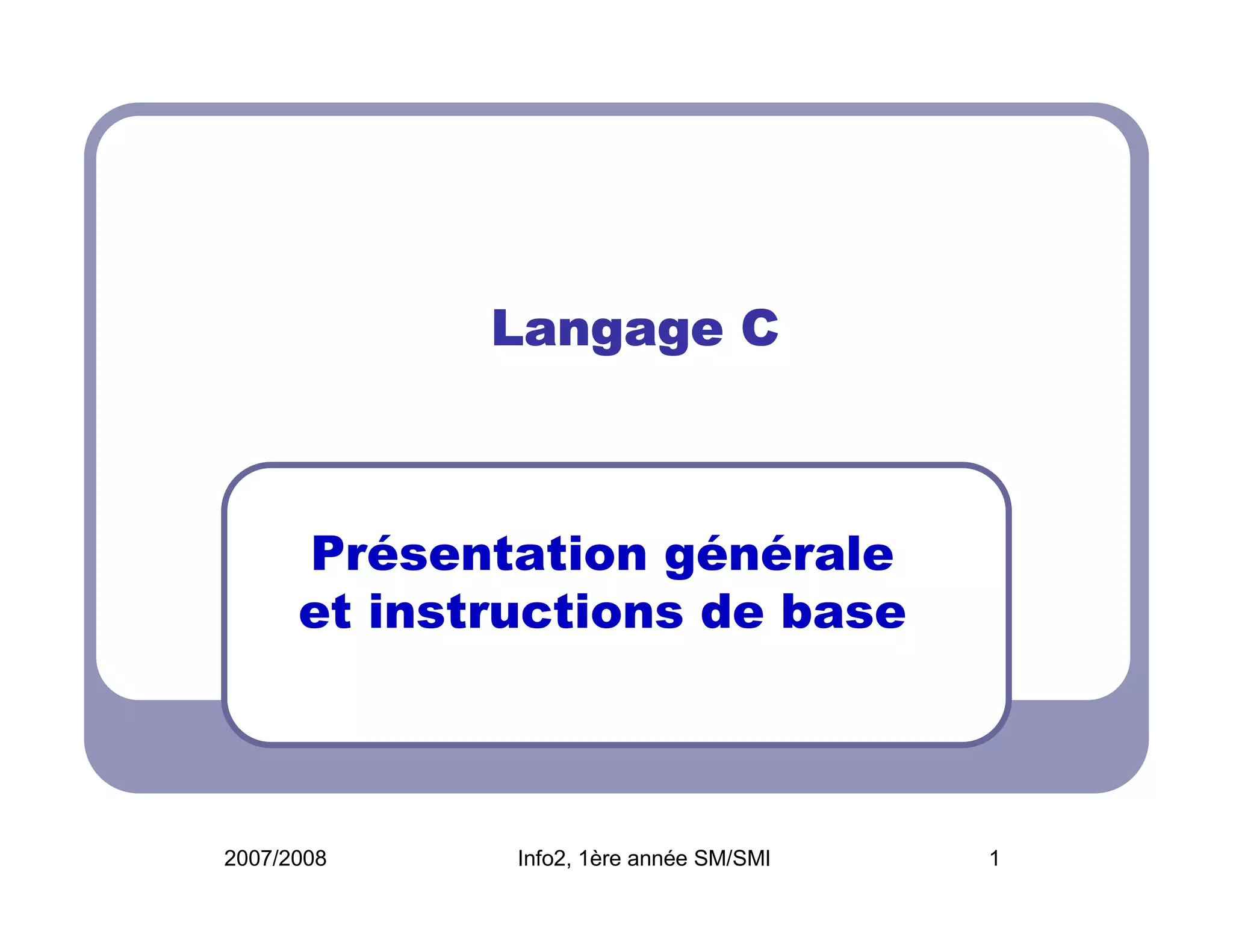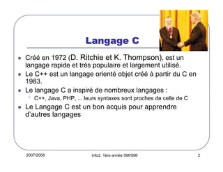 Le document présente une introduction au langage C, abordant ses origines, sa syntaxe, la déclaration et l'affectation des variables, les opérateurs, ainsi que la structure de programme avec des fonctions et des procédures. Il décrit également les différents types de données, les opérations de lecture et d'affichage, ainsi que la transmission des paramètres. Enfin, des concepts tels que les variables locales et globales, ainsi que la récursivité en programmation, sont expliqués.