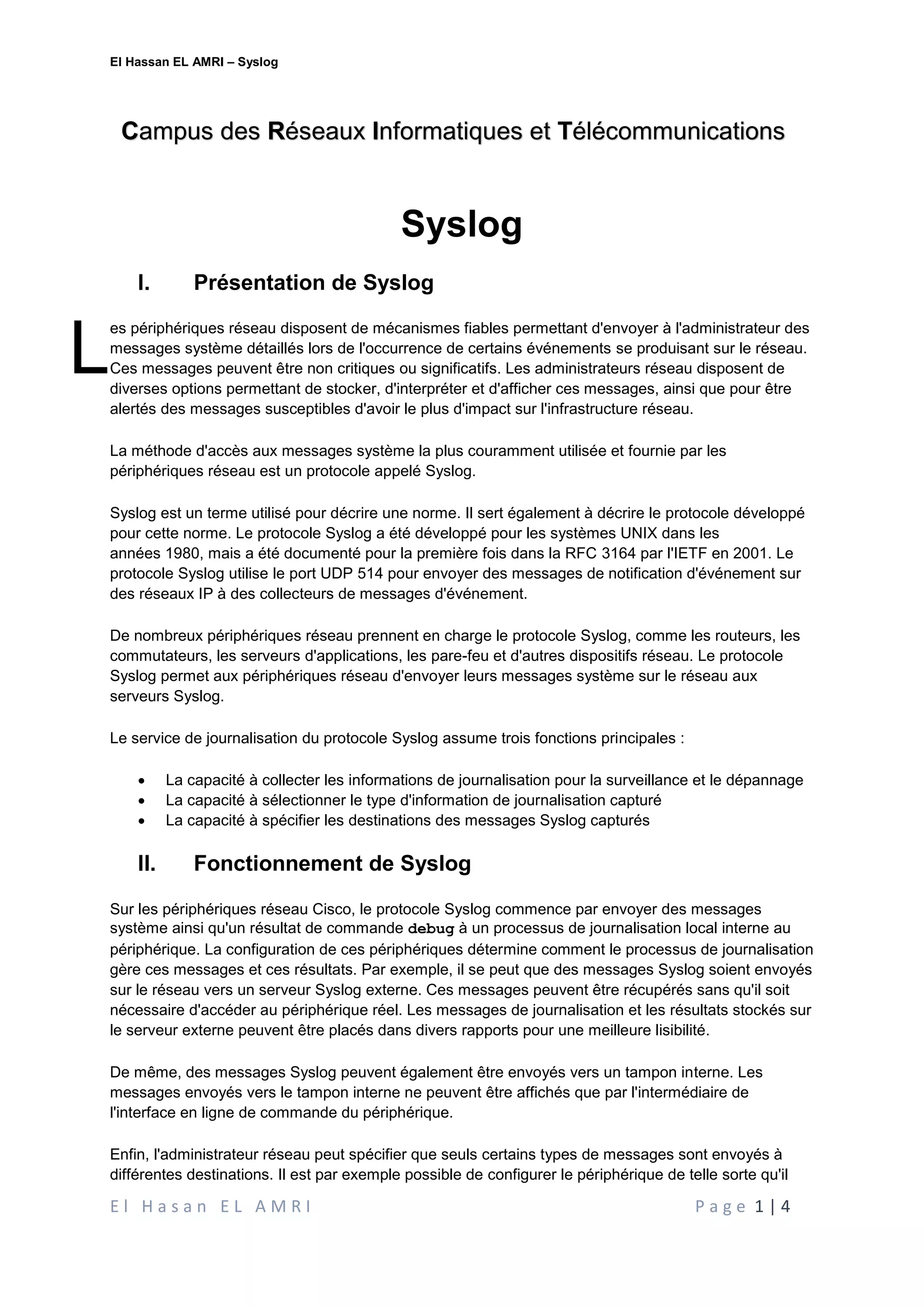 Le document présente le protocole syslog, qui permet aux périphériques réseau d'envoyer des messages système à des serveurs pour faciliter la surveillance et le dépannage. Il décrit également le fonctionnement de syslog sur des périphériques Cisco, ainsi que les niveaux de gravité des messages envoyés et leur configuration. Enfin, le document détaille comment configurer les routeurs et commutateurs pour envoyer des messages à un serveur syslog.