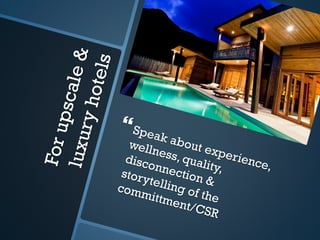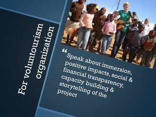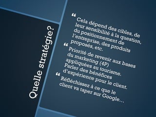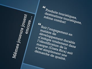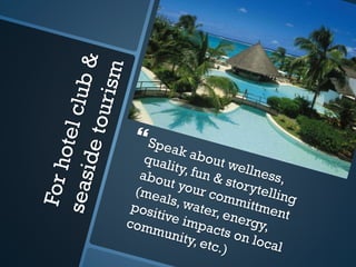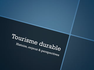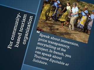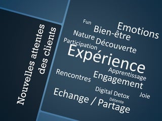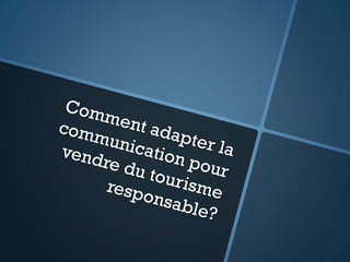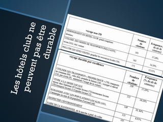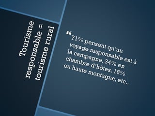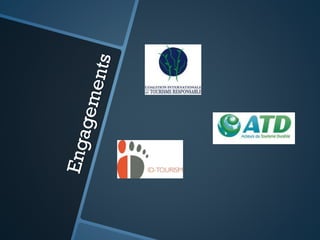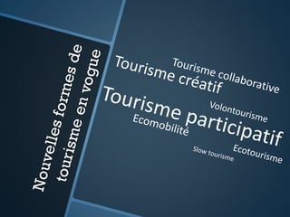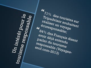 Le document aborde divers concepts de tourisme durable, y compris l'écotourisme, le volontourisme, et le tourisme responsable. Il mentionne également des types variés de tourisme, tels que le tourisme culturel et balnéaire. Enfin, il fournit des coordonnées pour un cabinet d'ingénierie et de marketing en tourisme durable.