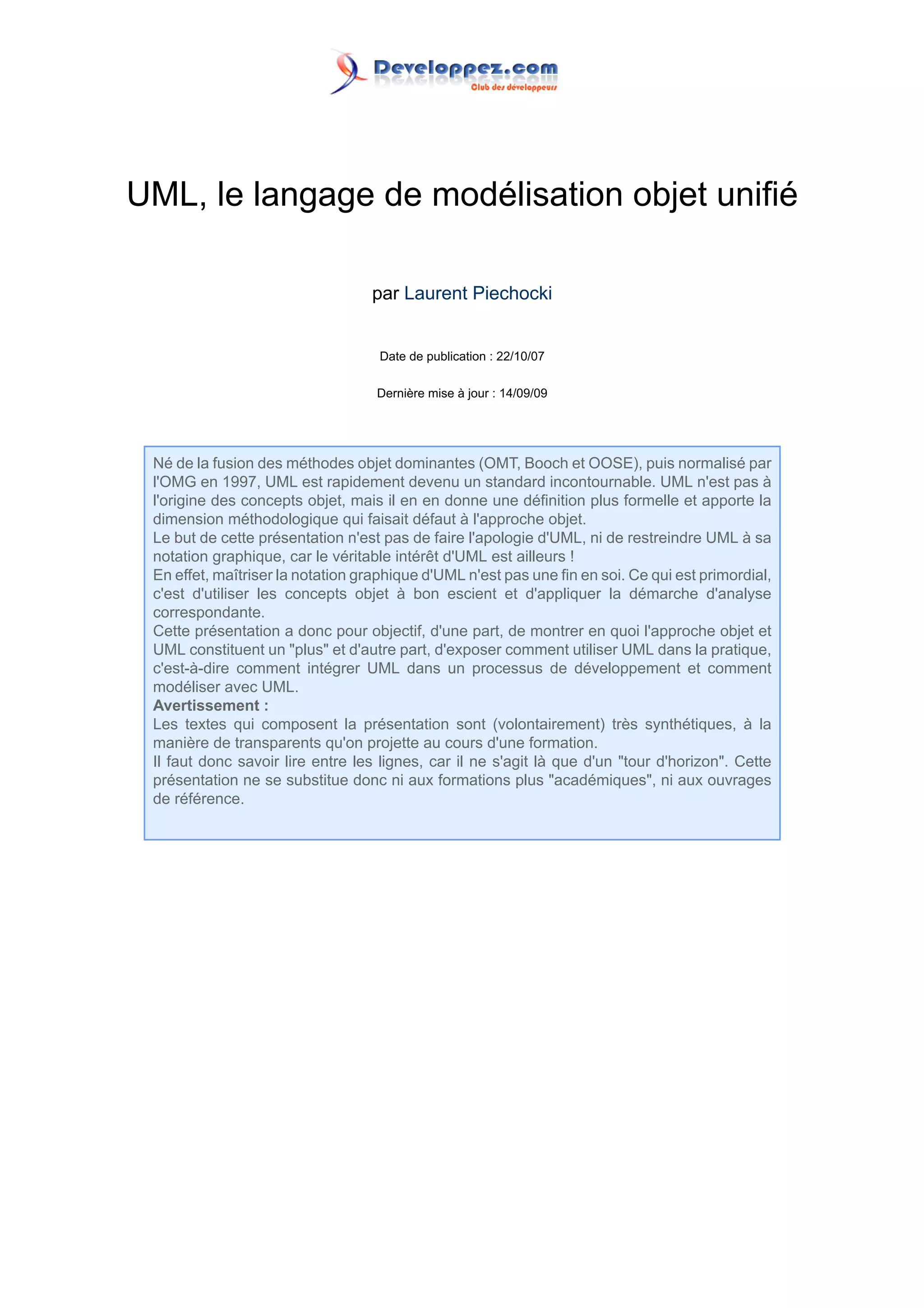 La présentation d'UML par Laurent Piechocki explique l'évolution et l'application du langage de modélisation objet unifié, né de la fusion de méthodes précédentes et normalisé par l'OMG en 1997. Au-delà de sa notation graphique, l'accent est mis sur l'utilisation efficace des concepts objets et de la méthodologie d'analyse dans un processus de développement. La présentation présente aussi les avantages et inconvénients d'UML et comment l'intégrer dans la pratique.