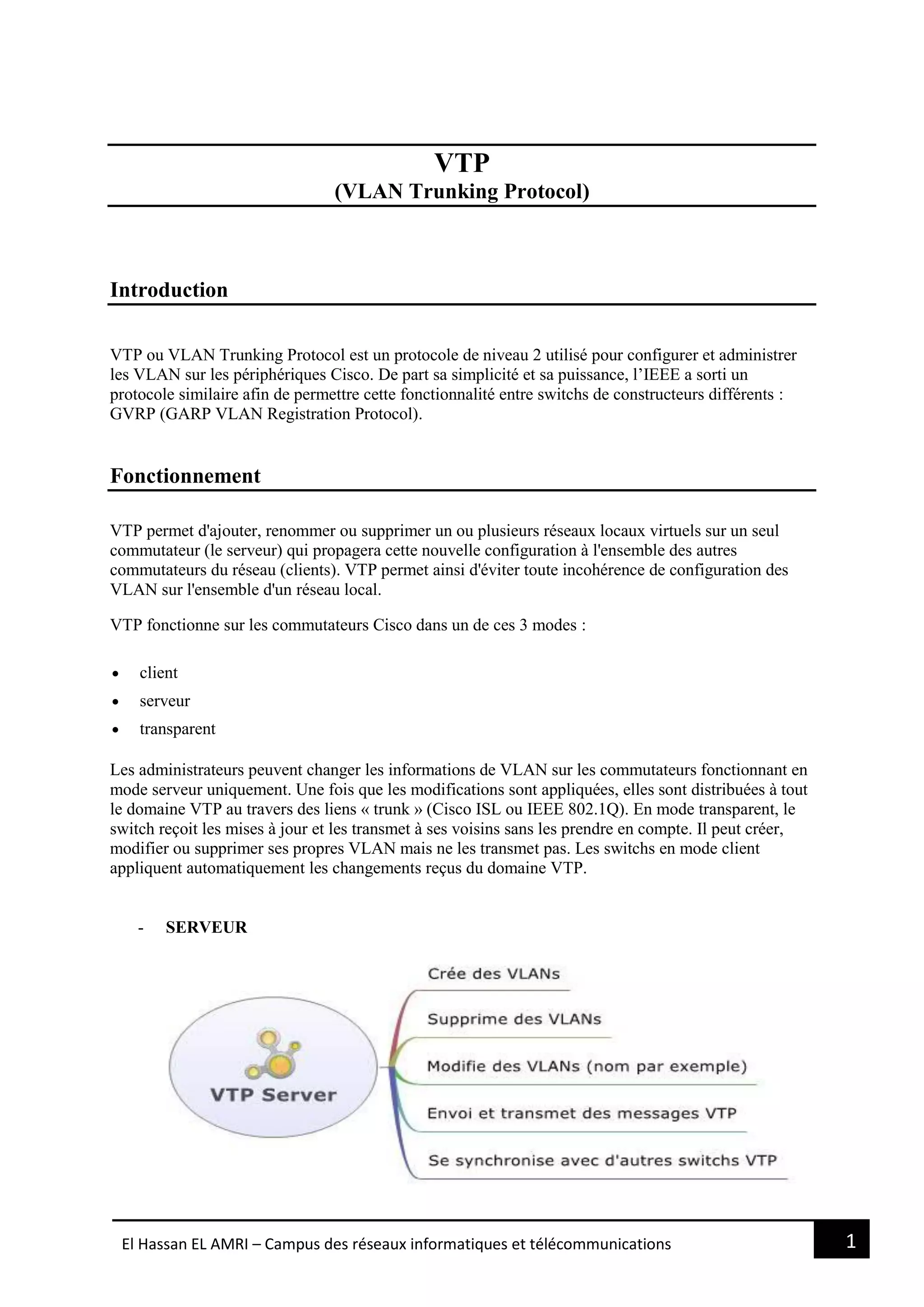 Le VLAN Trunking Protocol (VTP) est un protocole de niveau 2 utilisé pour gérer les VLAN dans les réseaux Cisco, permettant une configuration cohérente sur plusieurs commutateurs. Il fonctionne en trois modes : serveur, client et transparent, et synchronise les informations de VLAN par un numéro de révision (rn). Des fonctionnalités optionnelles, telles que le VTP pruning et la sécurité par mot de passe, peuvent également être mises en œuvre pour optimiser la gestion des VLANs.