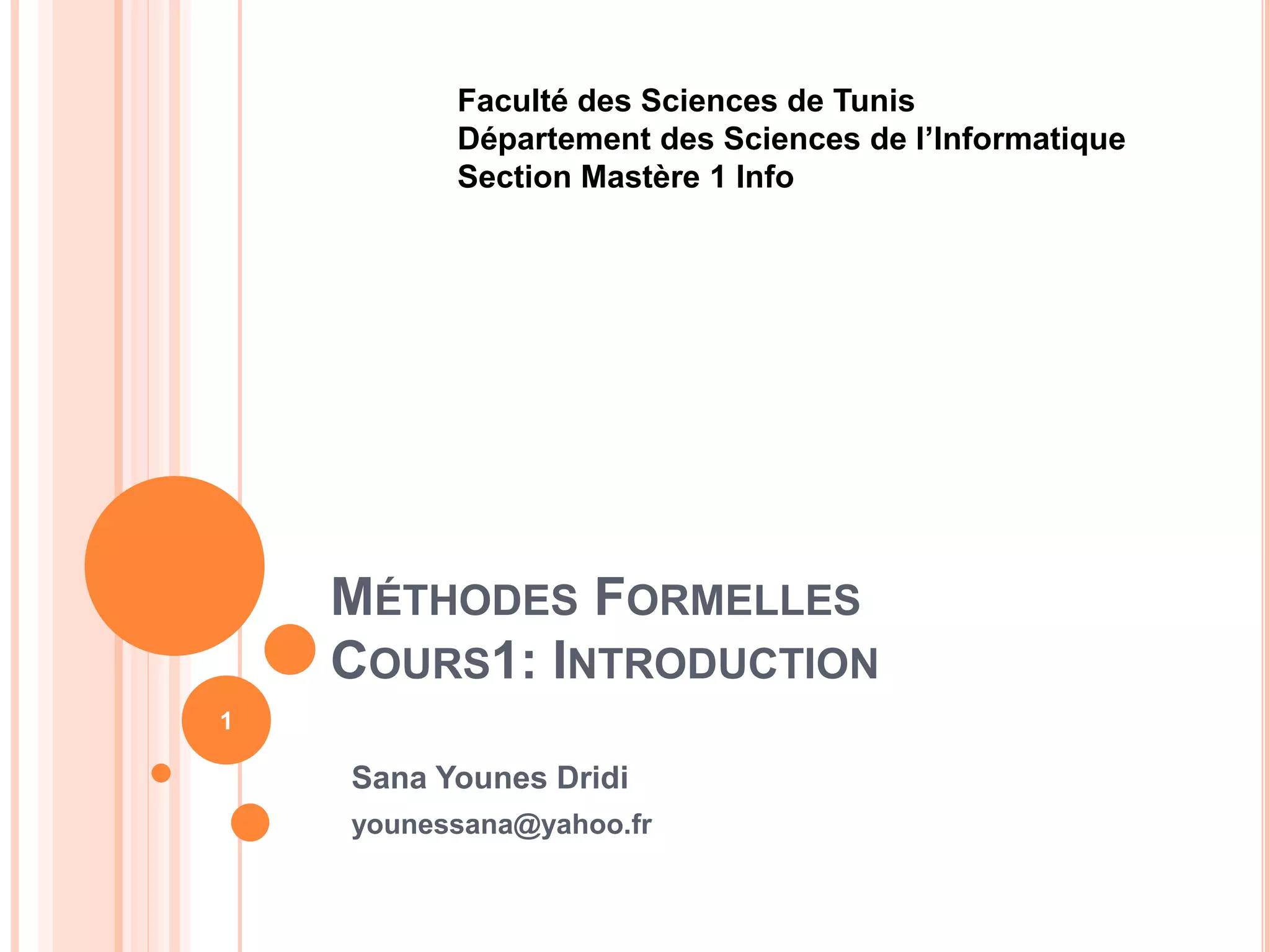 Le cours sur les méthodes formelles présente leur rôle crucial dans la modélisation, la spécification et la vérification des systèmes informatiques, face à la complexité croissante de ces derniers. Il aborde des concepts tels que la sûreté de fonctionnement, les étapes de développement d'un logiciel, ainsi que des exemples illustrant des échecs notables dus à des bugs. Les méthodes formelles, basées sur des outils mathématiques, se distinguent par leur exhaustivité et leur efficacité dans la vérification des systèmes, malgré une phase de conception plus longue.