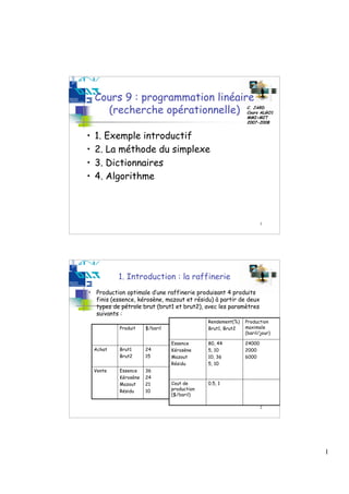 Le document aborde la programmation linéaire, en se concentrant sur la méthode du simplexe pour déterminer la production optimale d'une raffinerie à partir de deux types de pétrole. Il explique les variables de décision, les contraintes, et les itérations nécessaires pour maximiser le profit, ainsi que des exemples d'applications pratiques. Enfin, il aborde des concepts avancés tels que le dictionnaire et le pivotage dans le cadre de l'algorithme simplexe.