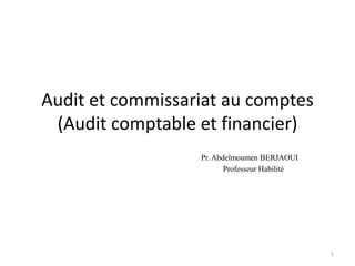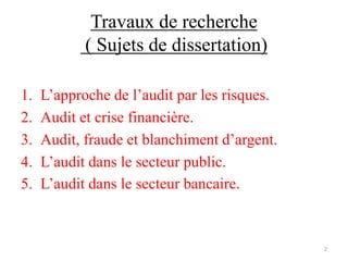 Le document traite de l'audit comptable et financier, en abordant des sujets tels que l'audit par les risques, l'audit dans le secteur public et bancaire, ainsi que les missions d'audit interne et externe. Il souligne l'importance de l'audit pour garantir la fiabilité de l'information financière et définit les étapes d'une mission d'audit, ainsi que les normes professionnelles en vigueur. Enfin, le document met en lumière les résultats attendus de l'audit, y compris l'opinion motivée de l'auditeur sur la situation financière d'une entité.