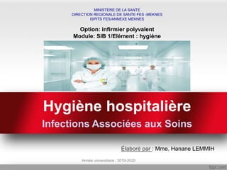 Le document traite de l'hygiène hospitalière et des infections associées aux soins (IAS), soulignant leur impact sur la santé publique, avec des statistiques sur la prévalence des IAS au Maroc et dans le monde. Il aborde les définitions, causes, mécanismes et conséquences des IAS, ainsi que les mesures de prévention recommandées pour lutter contre leur propagation dans les établissements de santé. La formation et la sensibilisation du personnel médical sont essentielles pour améliorer la sécurité sanitaire.