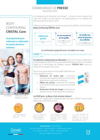 Le document présente le programme 'body contouring cristal care', une méthode innovante pour redessiner la silhouette grâce à des technologies comme la cryolipolyse et la stimulation électromagnétique. Trois étapes sont détaillées : éliminer la graisse, remuscler le corps et traiter la cellulite, avec des produits spécifiques comme cristal pro, cristal fit et diamond. Les tarifs et résultats attendus sont également fournis, soulignant l'importance d'un accompagnement médical et d'un mode de vie sain pour des résultats durables.