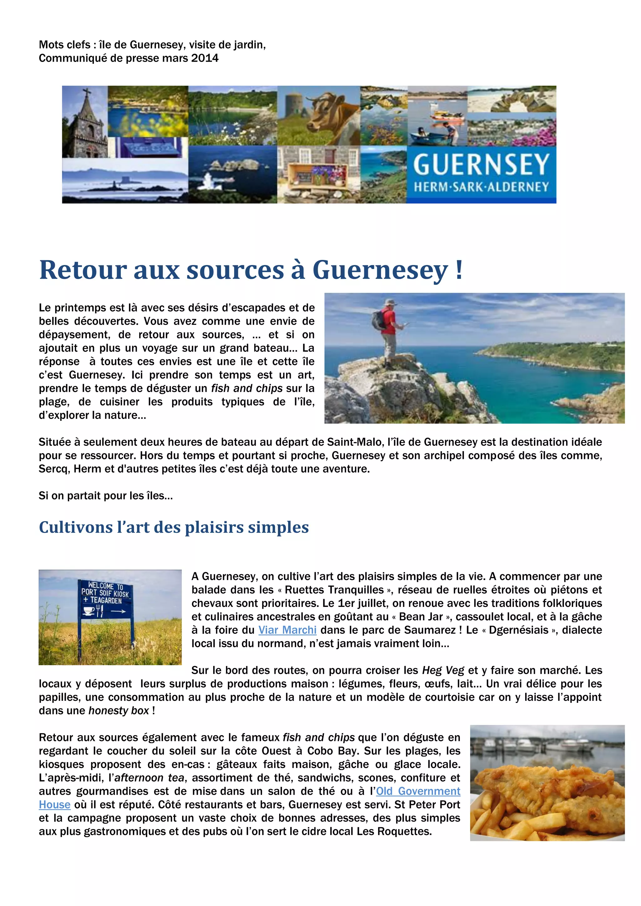 La visite de l'île de Guernesey, accessible en bateau depuis Saint-Malo, offre une échappatoire pour ceux en quête de dépaysement et de plaisirs simples, incluant des dégustations de produits locaux comme le fish and chips. Des événements saisonniers, tels que la semaine de randonnée et la semaine des fleurs, permettent de découvrir la nature et les jardins de l'île. Guernesey, avec son climat tempéré, se profile comme une destination idéale pour une escapade printanière, où les visiteurs peuvent savourer l'art de vivre local.