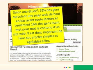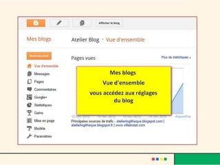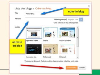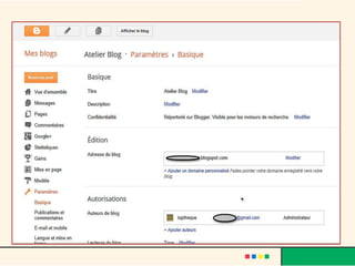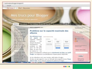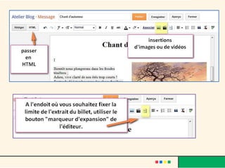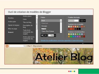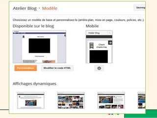 Le document décrit l'évolution du web, passant du web 1.0 au web 3.0, et met en avant le rôle des blogs comme moyen d'expression personnelle et d'interaction sociale. Il fournit également des instructions sur la création d'un blog avec des plateformes comme Blogger, en abordant la personnalisation, l'insertion de médias, et les avantages d'interagir avec les lecteurs. Finalement, le texte souligne les caractéristiques de la blogosphère et son impact sur la création de communautés en ligne.
