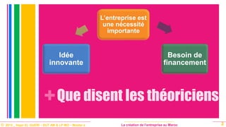 Ce document traite des étapes essentielles de la création d'une entreprise au Maroc, incluant l'idée innovante, la validations de l'adéquation entre le projet et l'entrepreneur, ainsi que les formalités légales nécessaires. Il souligne l'importance d'une étude de marché approfondie et d'un business plan solide pour attirer les financements. Finalement, il aborde la mise en place pratique de l'entreprise et le développement de sa stratégie commerciale.