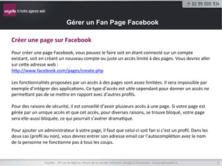 Le document décrit comment gérer une page Facebook, en abordant la création, les accès, les rôles des administrateurs et les fonctionnalités disponibles. Il explique également comment publier des statuts, créer des événements, et analyser les statistiques de la page. Des conseils sur l'ajout d'applications et d'onglets sont fournis, ainsi que des ressources pour approfondir le sujet.