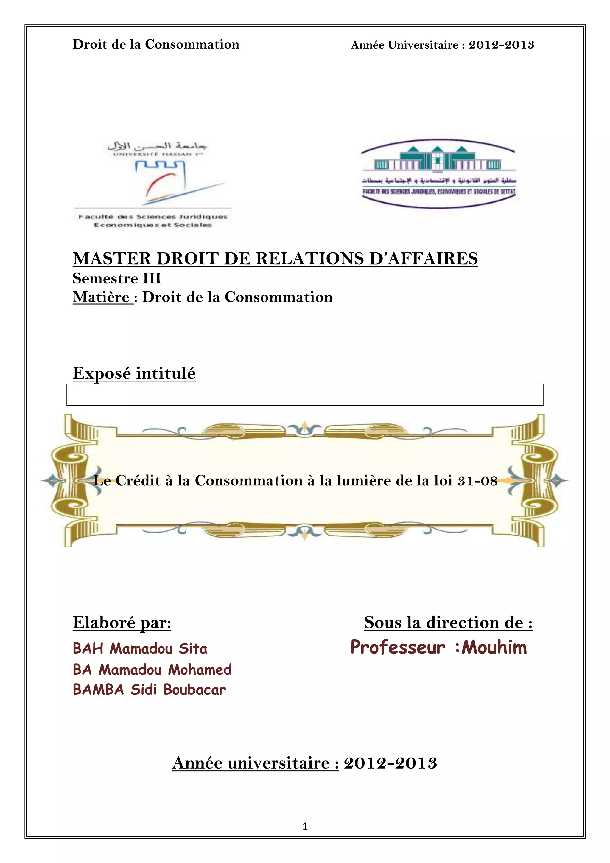 Le document présente une analyse du crédit à la consommation au Maroc, en soulignant son évolution, ses impacts sur l'endettement des ménages, et le cadre légal instauré par la loi 31-08 pour protéger les consommateurs. Il détaille également les types de crédits concernés, les acteurs impliqués, et les limitations de la loi concernant certaines opérations de crédit. La croissance du crédit à la consommation est mise en relation avec les changements réglementaires et la concurrence accrue dans le secteur.