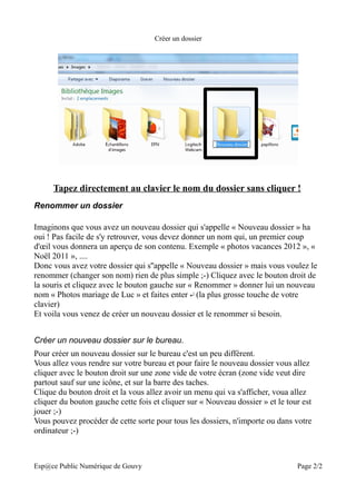 Le document explique comment organiser des dossiers et fichiers sur un ordinateur par analogie avec un système de rangement physique. Il détaille la création et le renommage de dossiers, en insistant sur l'importance de nommer les dossiers de manière logique pour faciliter la recherche. Des instructions spécifiques sont fournies pour créer des dossiers dans différents emplacements, y compris sur le bureau.