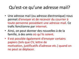 Une adresse mail permet d'envoyer et de recevoir des messages et des documents via Internet, composée d'un nom d'utilisateur, d'un arobase et d'un hébergeur. Le document décrit le processus de création d'une adresse mail sur l'hébergeur Hotmail, y compris les choix d'identifiant et l'importance de la sécurité avec un mot de passe. Il souligne également l'importance de se déconnecter après utilisation pour protéger l'accès à la boîte mail.