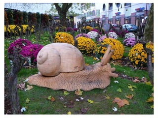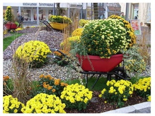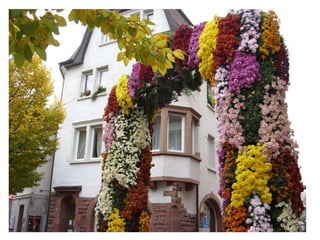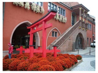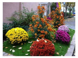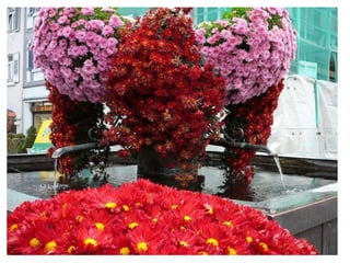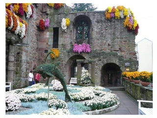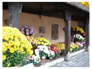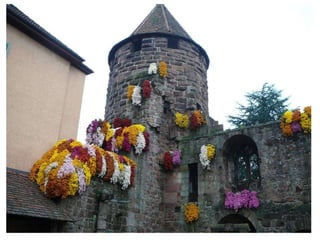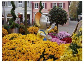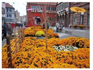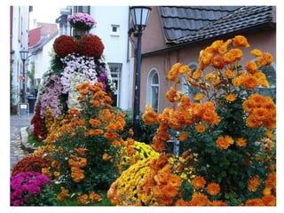 Le document évoque la fête du chrysanthème à Lahr, en Allemagne, mettant en avant un massif coloré et des fontaines de fleurs. Il mentionne une bonne récolte et inclut un diaporama créé par Marie-Odile et Francis en novembre 2008.